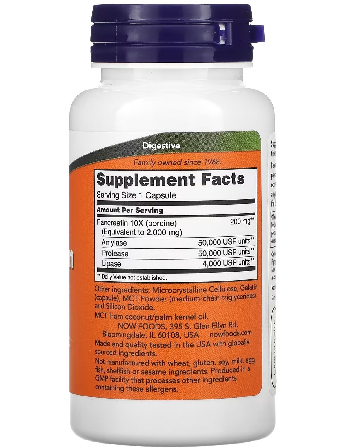 - Кількість в 1 порції: Панкреатин 10Х (свинячий) (еквівалент 2000 мг) 200 мг, Амілаза 50 000 одиниць USP **, Протеаза 50 000 одиниць USP **, Ліпаза 4000 одиниць USP.