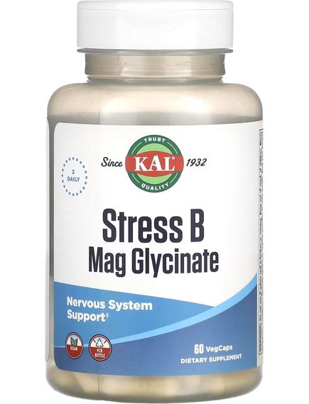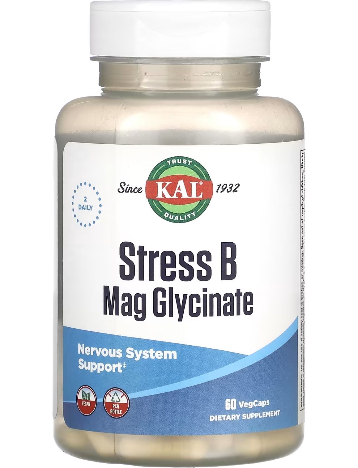 Добавка Stress B Mag Glycinate від KAL® містить вітаміни групи B та магній в ефективній формі гліцинату. Коферментні вітаміни B6 (P-5-P), B12 (метилкобаламін і аденозилкобаламін) і фолат (5-MTHF) визнані біологічно активними формами.