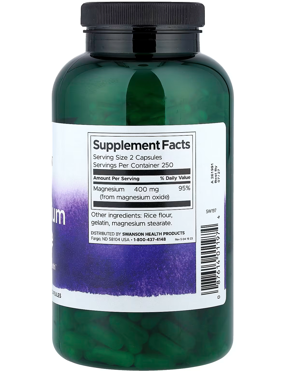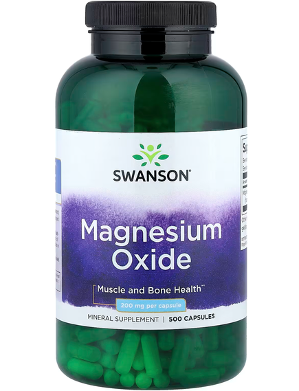 Магній — важливий мікроелемент, необхідний для гарного здоров’я. Оксид магнію від Swanson містить 200 мг магнію, щоб допомогти вам задовольнити ваші щоденні потреби. Магній необхідний для більш ніж 600 біохімічних реакцій в організмі. Він необхідний для міцних м’язів і кісток, здоров’я серцево-судинної системи та роботи нервової системи.