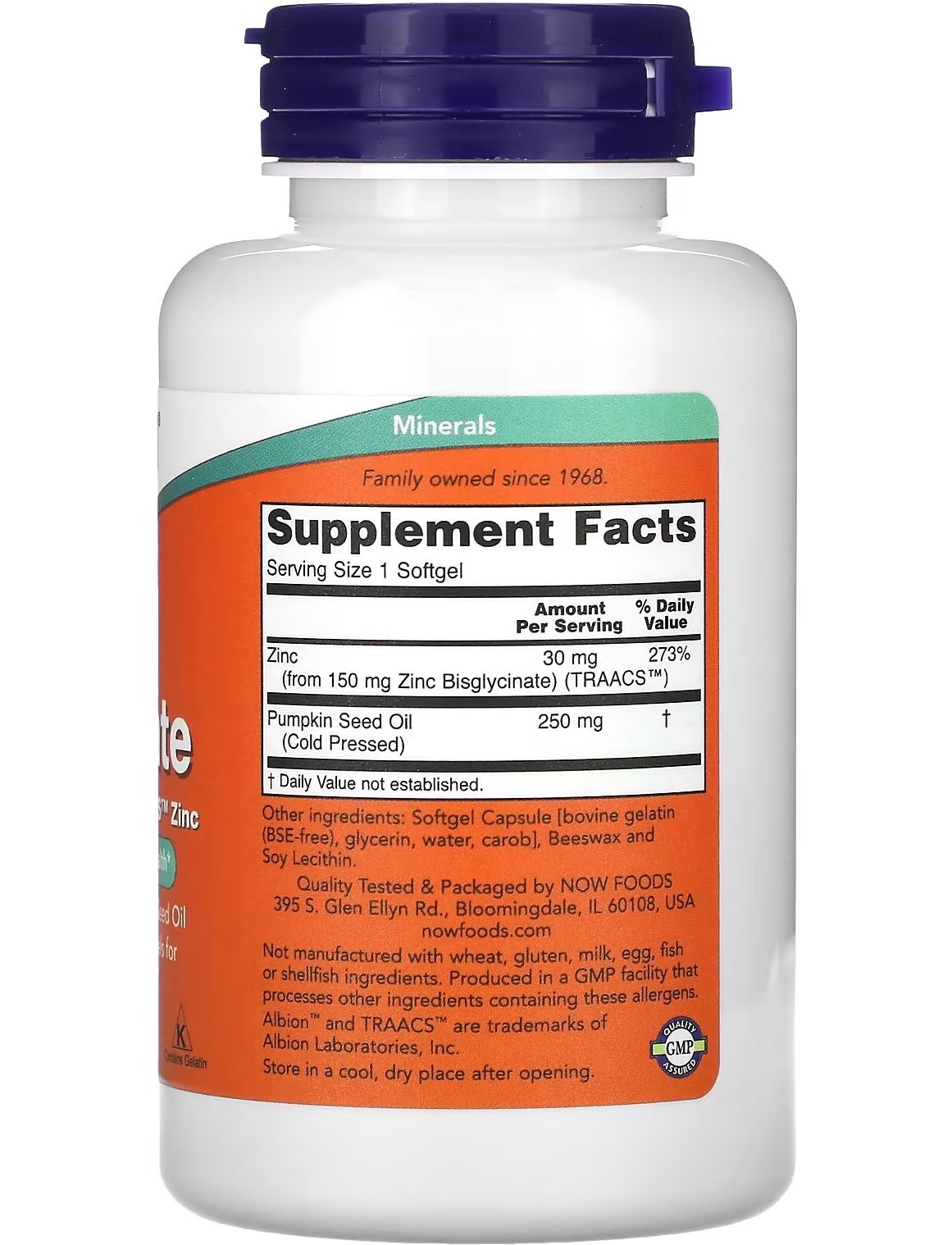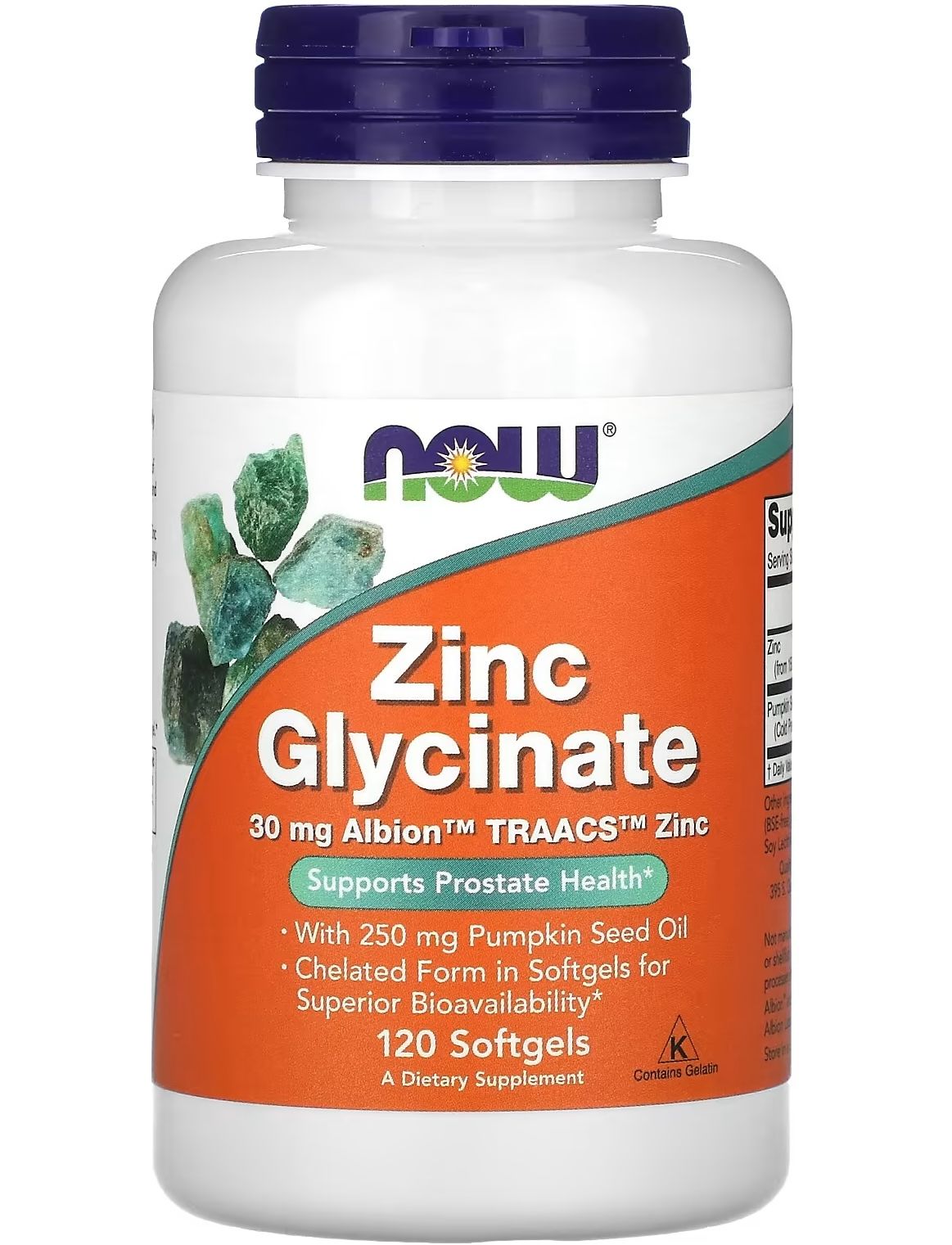 Цинк має найважливіше значення для кількох сотень ферментативних реакцій, пов’язаних з метаболізмом білків і вуглеводів, синтезом РНК і ДНК і міжклітинної передачею сигналів. Цинк життєво необхідний для нормального функціонування багатьох органів і систем організму, підтримки здоров’я імунної, кісткової, нервової та ендокринної систем організму, а також здоров'я простати. Цинк, що отримується з їжею, має відносно низьку біодоступність, тому гліцинат цинку від NOW® виробляється в хелатній формі для поліпшення абсорбції і біодоступності і випускається у формі капсул, які легко ковтати.