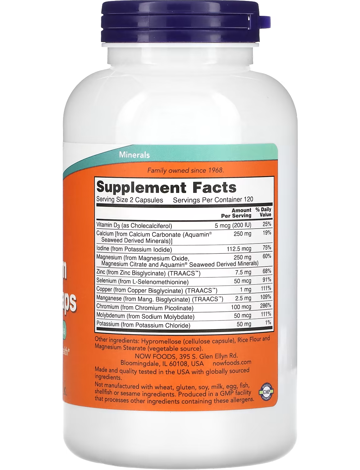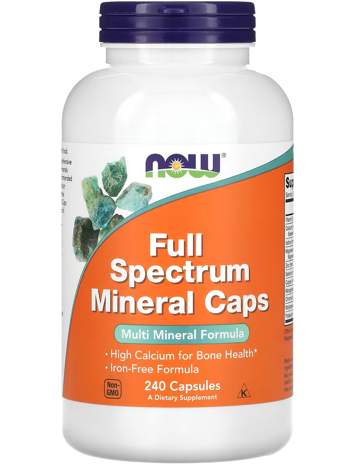 Капсули з мікроелементами повного спектру від Now — це комплексна комбінація найважливіших харчових мікроелементів, що використовуються організмом. Ця формула містить рекомендовані кількості незамінних мікроелементів, включаючи кальцій для зміцнення кісток і зубів, а також цинк для підтримки імунної системи. Капсули з мікроелементами повного спектру — це добавка, що не містить заліза та має співвідношення кальцію й магнію 1:1.