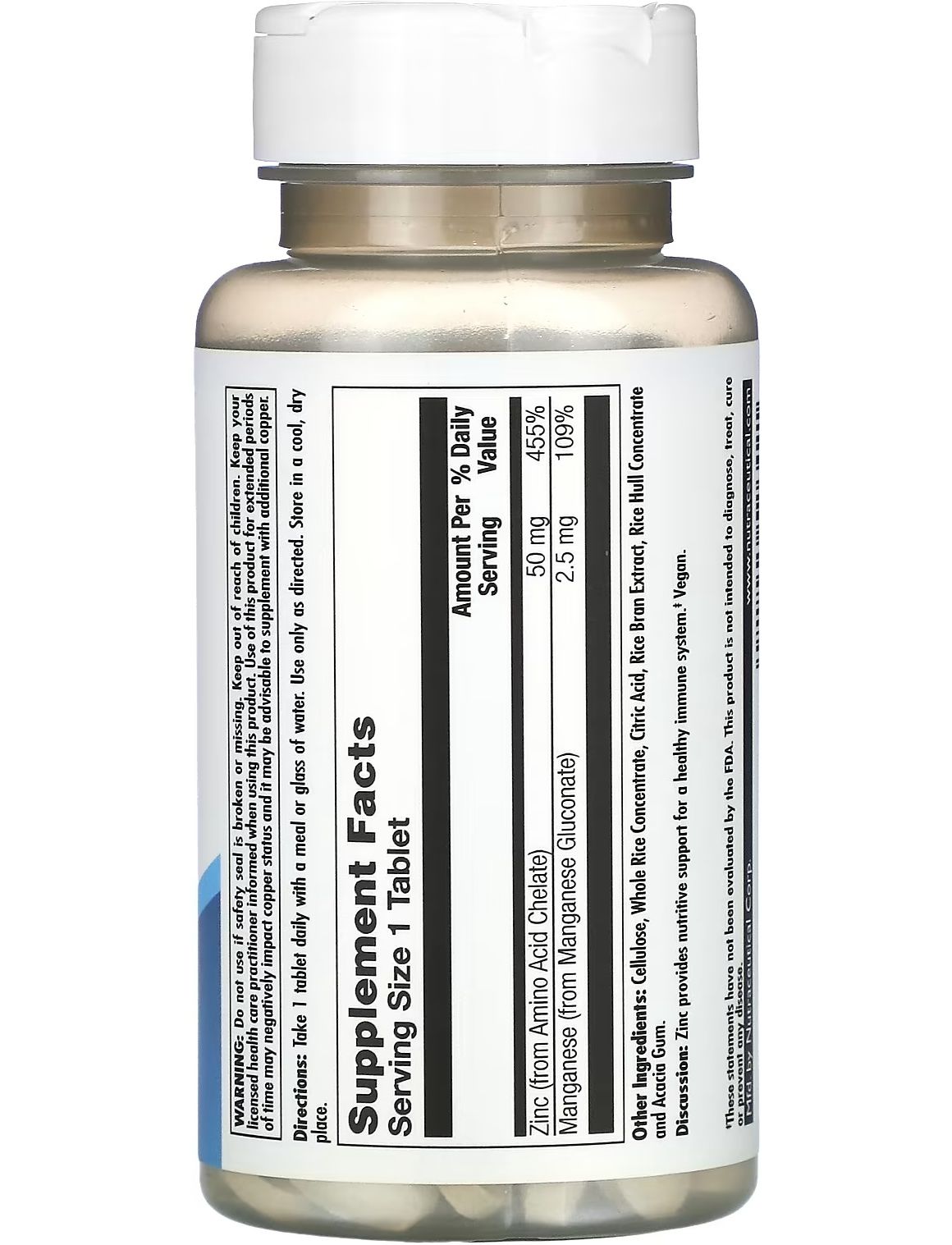 - Кількість в 1 порції: Цинк (з амінокислотного хелату) 50 мг, Марганець (з глюконату марганцю) 2,5 мг