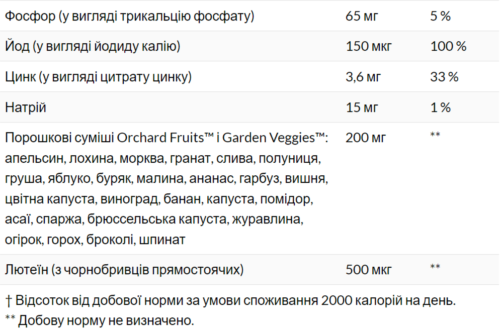 - Порошкові суміші Orchard Fruits™ і Garden Veggies™ (200 мг в 1 порції)