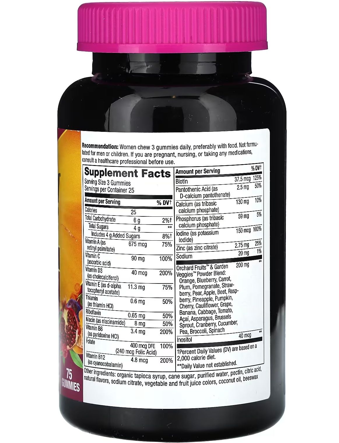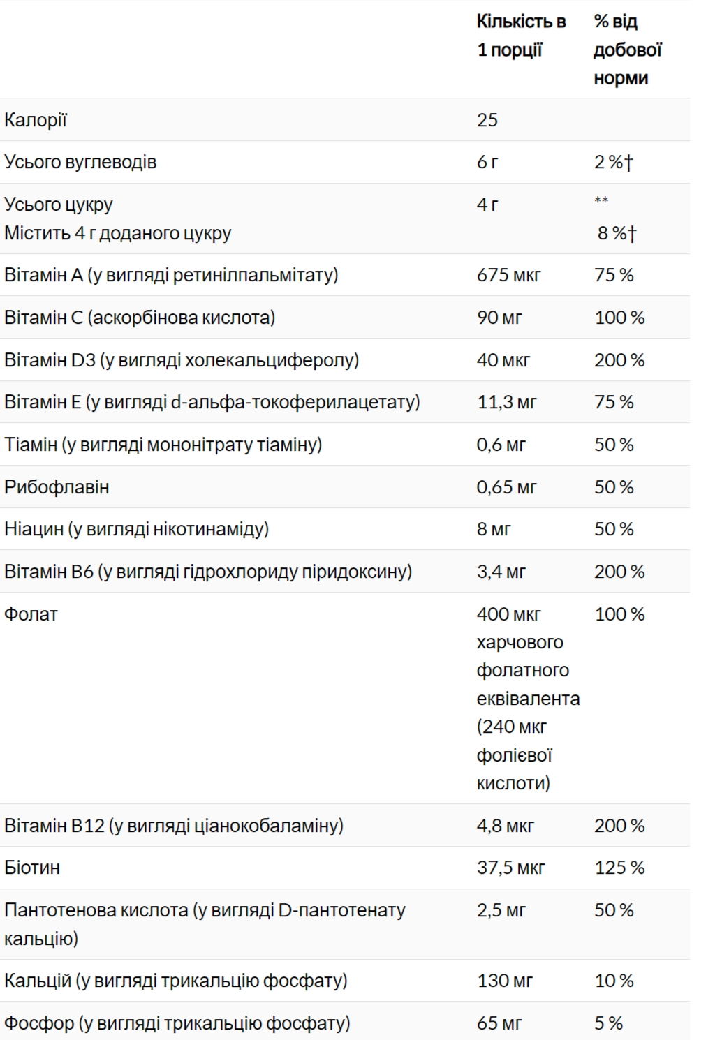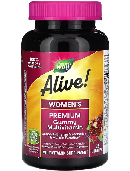- ‡ Містить більше тіаміну (0,6 мг замість 0,3 мг) і ніацину (8 мг замість 4 мг) у порції з 3 жувальних мармеладок, ніж комплекс. Alive!® непреміальної якості для жінок (15903) у порції з 2 жувальних мармеладок.
