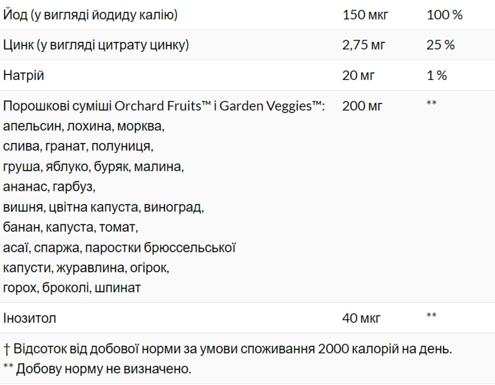 - Порошкові суміші Orchard Fruits™ і Garden Veggies™ (200 мг в 1 порції)