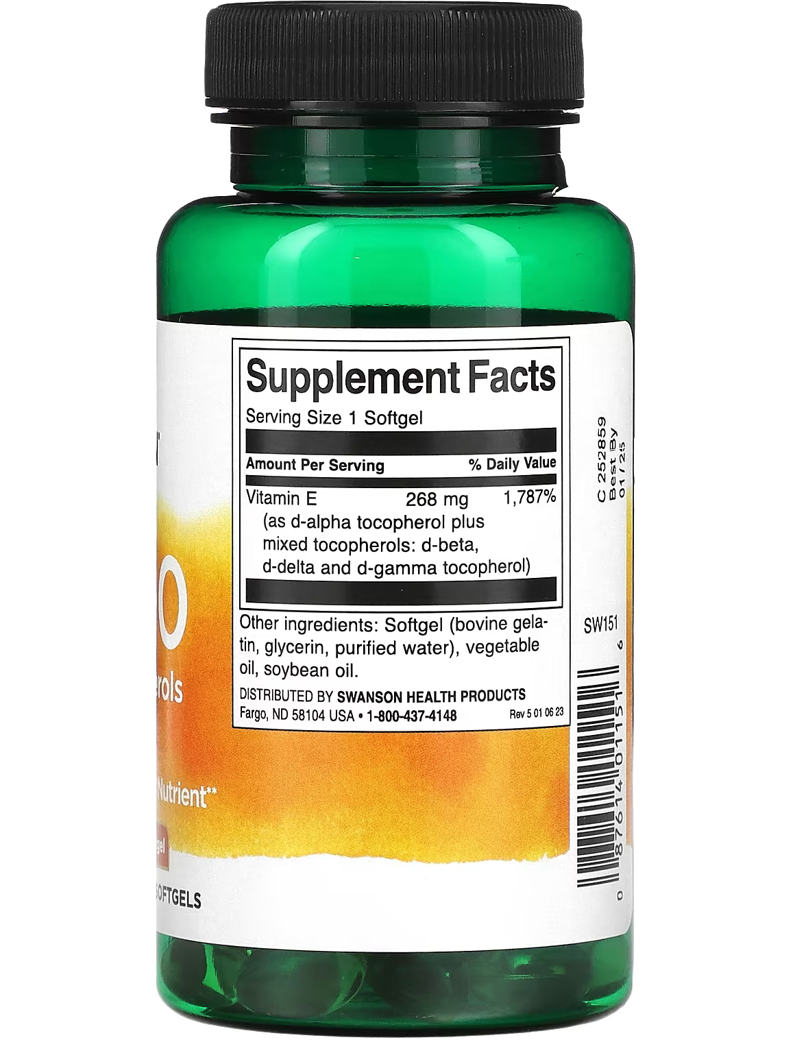 - Кількість в 1 порції: Вітамін E (у вигляді d-альфа-токоферолу зі змішаними токоферолами: d-бета, d-гамма та d-дельта токоферолами) 268 мг