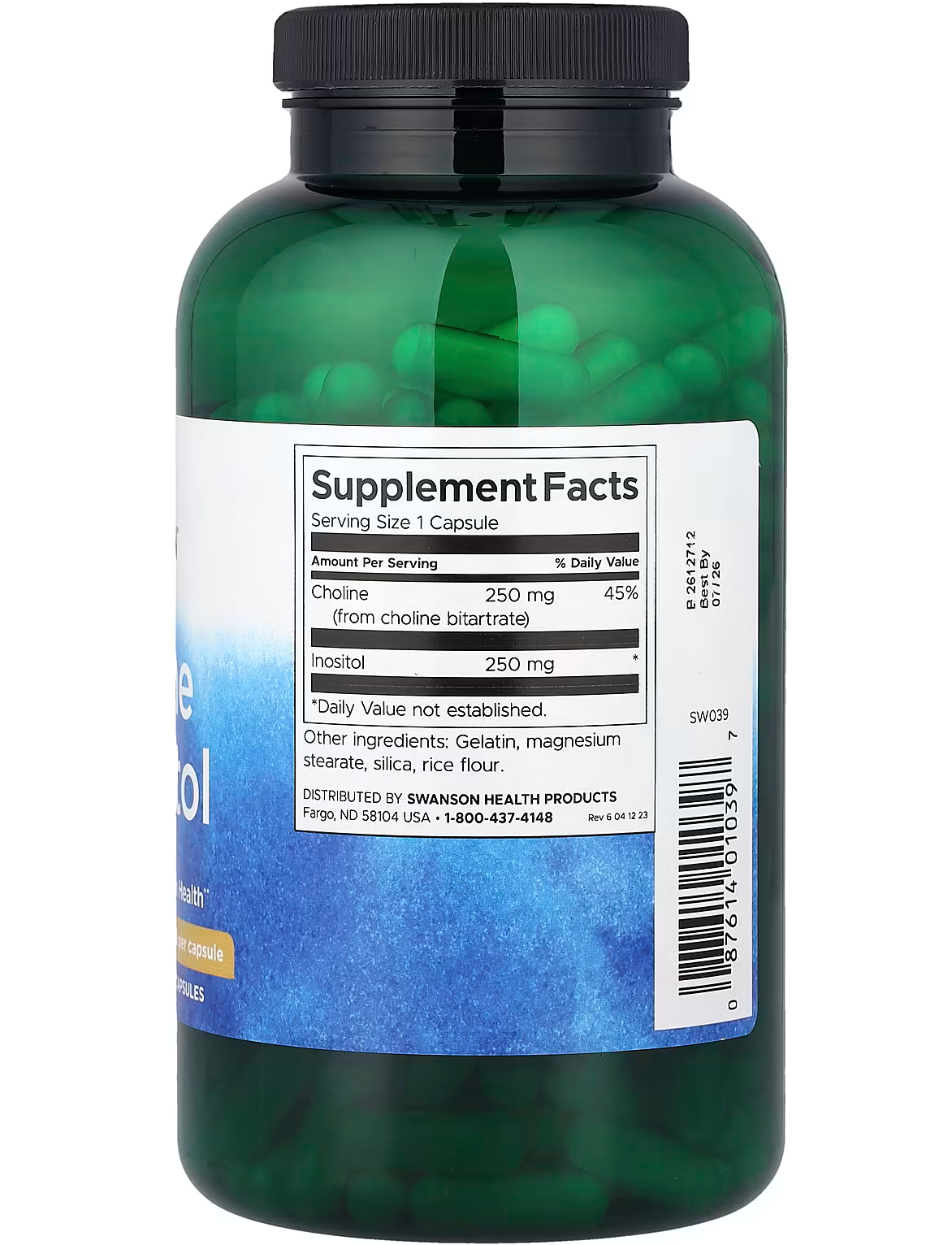 Корисна знахідка для вашого тіла та розуму! Холін та інозитол від Swanson містять 250 мг на порцію кожної з цих важливих поживних речовин. Холін, який іноді називають вітаміном B4, та інозитол тісно взаємодіють, створюючи хімічні «посланники», які допомагають підтримувати роботу мозку та центральної нервової системи.