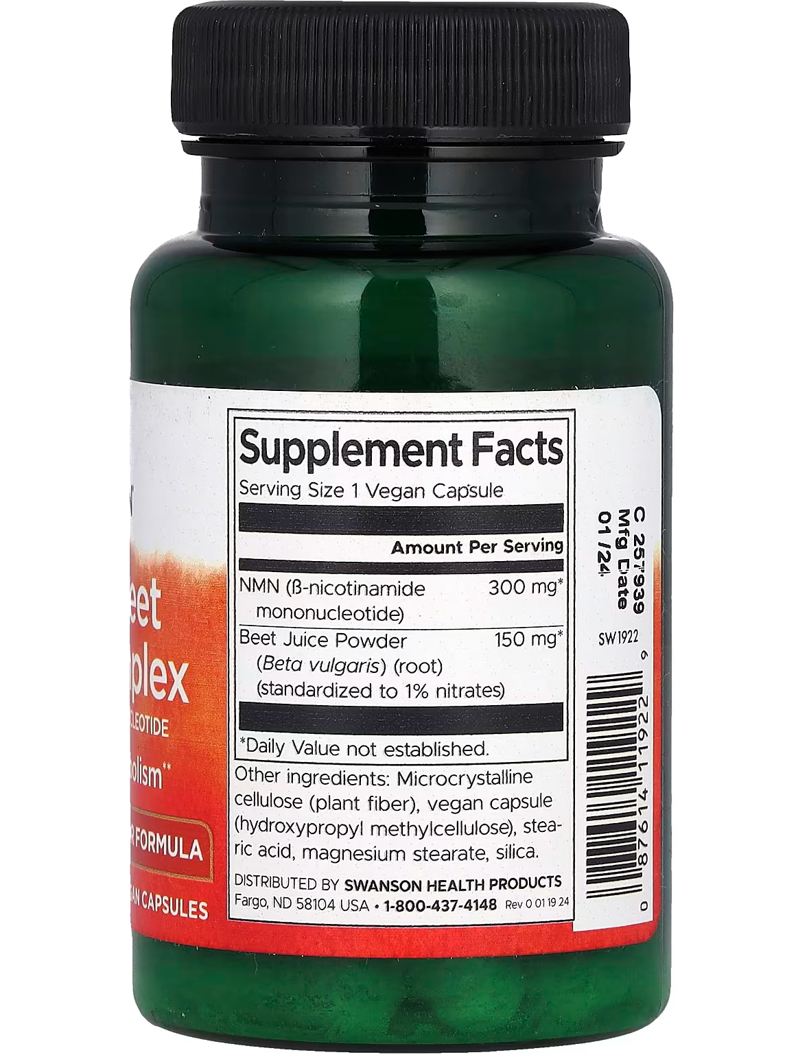 - Кількість в 1 порції: NMN (β-нікотинамід мононуклеотид) 300 мг, Порошок із коренеплоду буряка (Beta vulgaris) (стандартизований до 1 % нітратів) 150 мг
