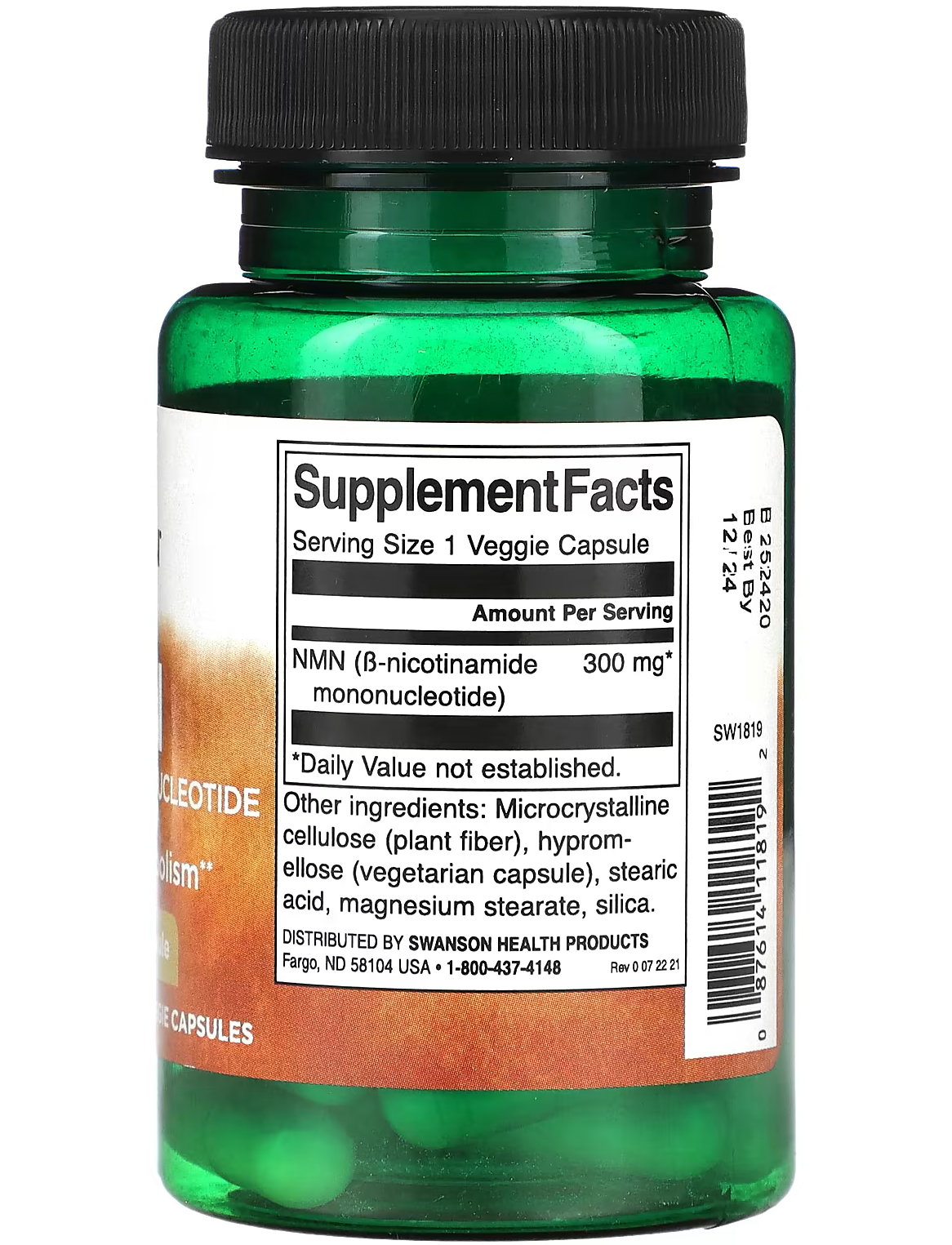 NMN від Swanson допомагає підтримувати нормальний рівень NAD+ в організмі. Кожна порція з однієї капсули містить 300 мг на 98 % чистого нікотинаміду мононуклеотиду. Додавання добавки NMN до вашого раціону допоможе підтримувати здоровий метаболізм і рівень глюкози, а також здорову чутливість до інсуліну, особливо в жінок у після менопаузи.