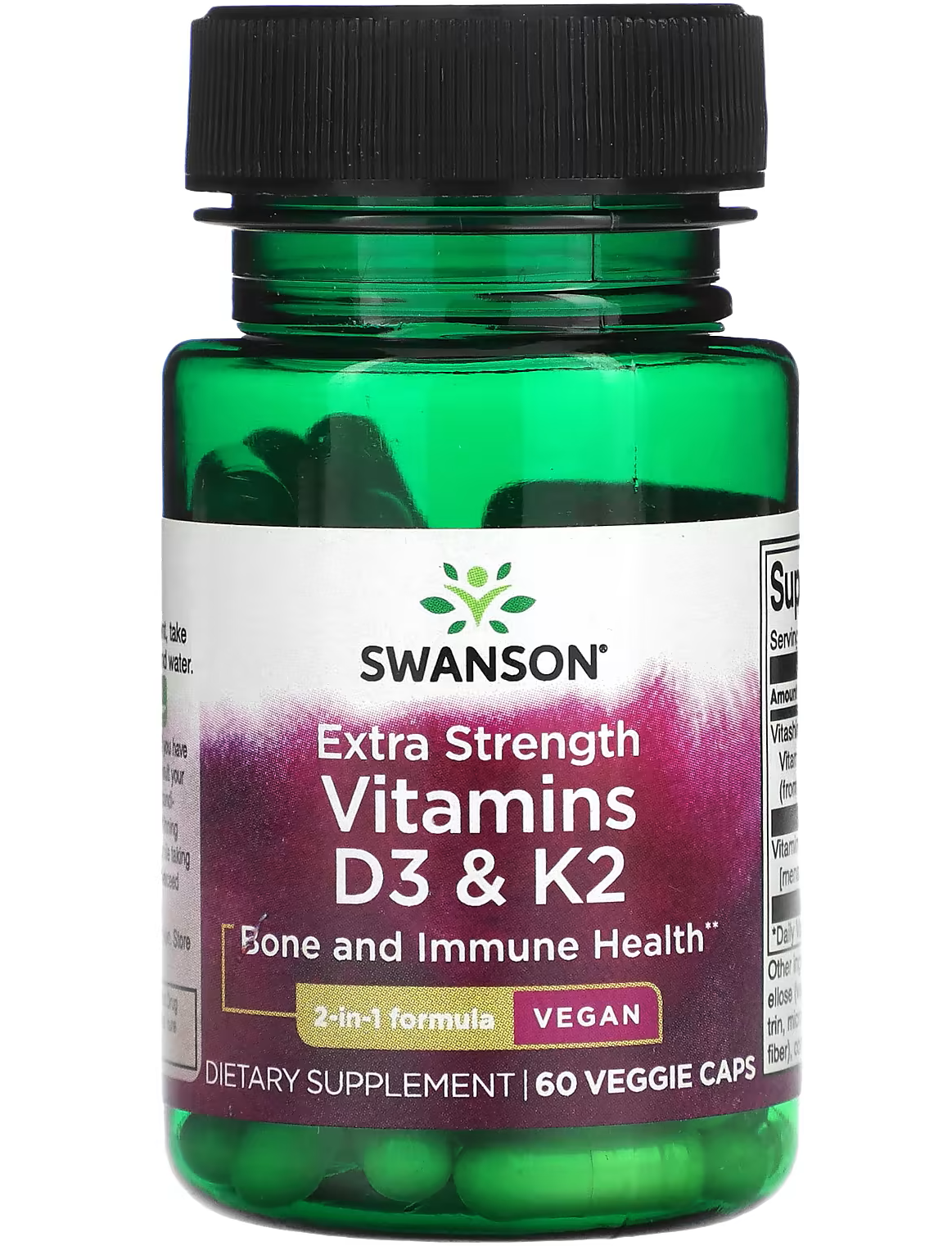 Разом краще! Нові дослідження показують, що вітаміни D3 та K2 — дві ключові поживні речовини для ефективного використання кальцію організмом — можуть принести ще більше користі, якщо приймати їх разом. Добавка з вітамінами D3 та K2 від Swanson пропонує ці корисні для здоров’я кісток і серця речовини в зручних вегетаріанських капсулах для приймання один раз на день.