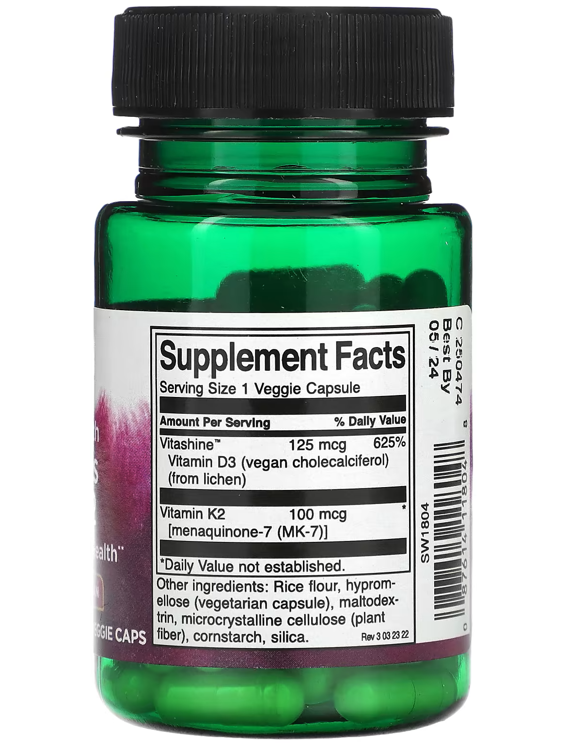 А що як ви вже приймаєте вітаміни D та K або отримуєте їх із раціону? Тепер Swanson пропонує комбінацію низьких доз вітамінів D3 та K2 саме для вас. Низькодозована добавка з вітамінами D3 та K2 від Swanson містить 125 мкг (5000 МО) веганського вітаміну D3, отриманого з лишайника, і 100 мкг вітаміну K2 з нуту (без сої) у вигляді MK-7 у веганській капсулі для приймання один раз на день. Вона забезпечує підтримку серцево-судинної системи, а також зміцнення та здоров’я кісток.