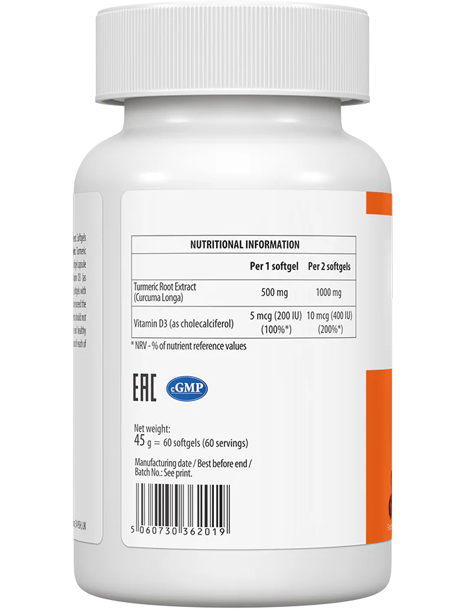 Поєднання куркуміну з вираженими протизапальними й антиоксидантними властивостями та вітаміну D3, необхідного для здоров’я кісток, зубів і м’язів, робить продукт ідеальним вибором для щоденної підтримки організму.