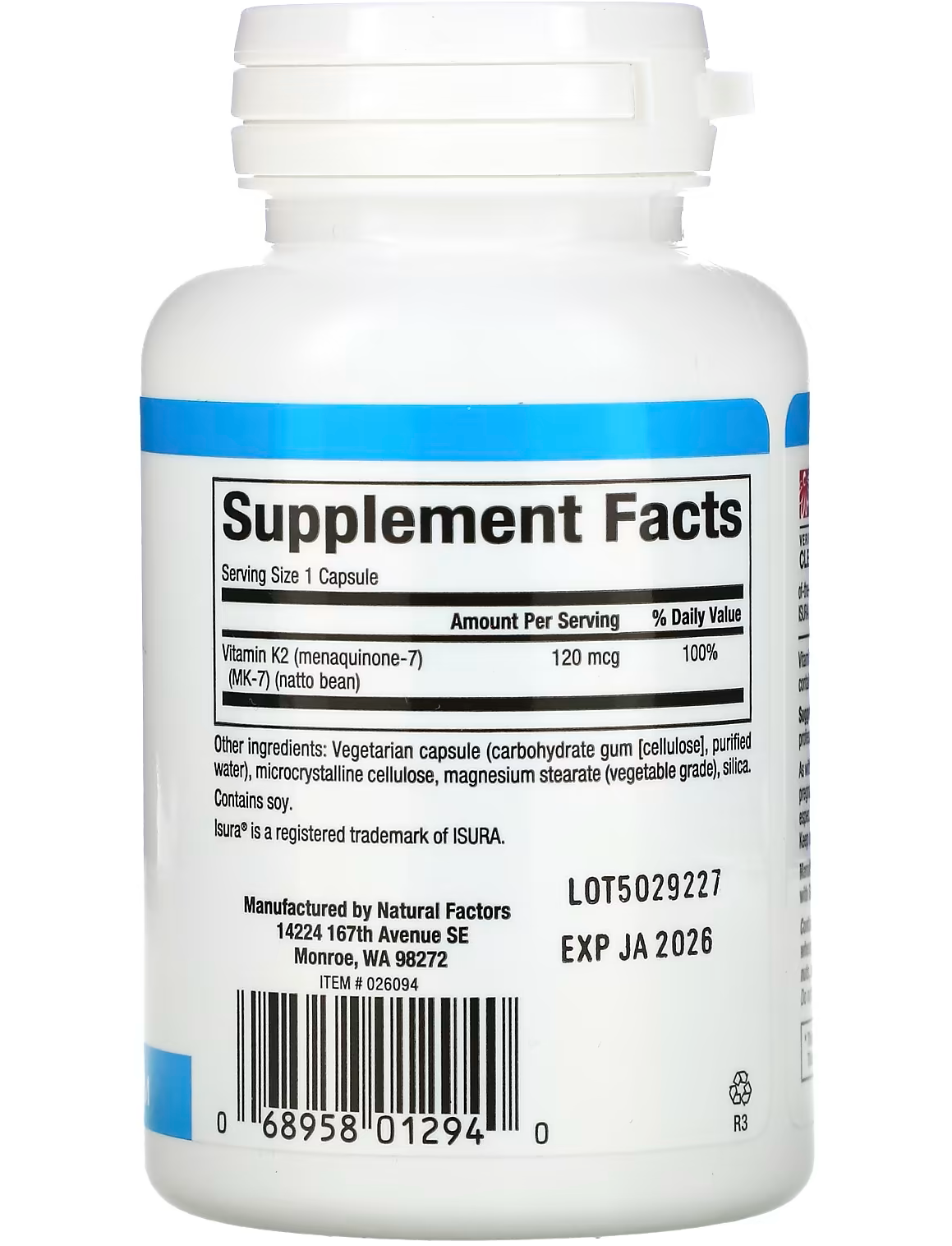 - Кількість в 1 порції: Вітамін K2 (менахінон-7) (MK-7) (натто) 120 мкг