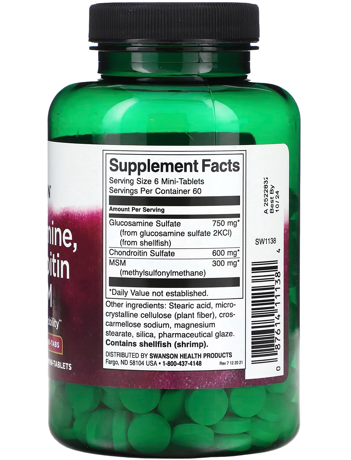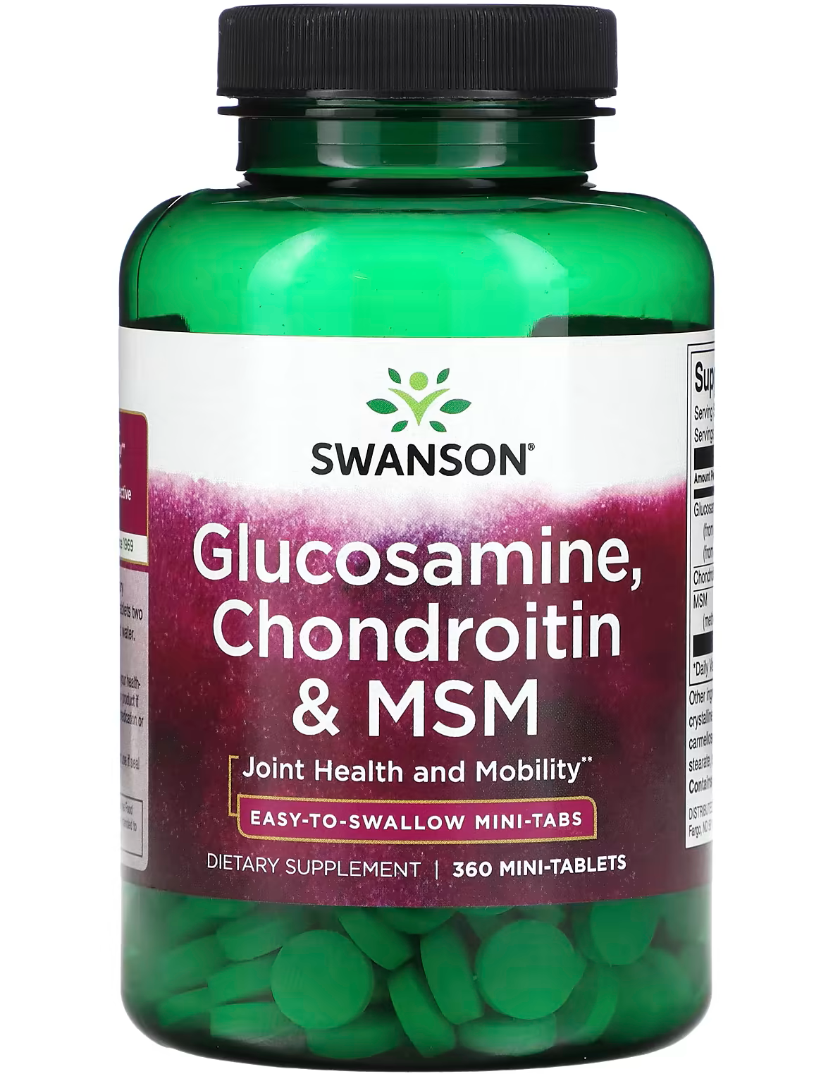 Тепер отримати користь від здатності глюкозаміну, хондроїтину та МСМ від Swanson живити суглоби стало ще простіше, ніж будь-коли! Ці три поживні речовини — найпопулярніші, найбільш досліджені й ефективні добавки для суглобів, але деяким людям важко ковтати великі капсули й таблетки, що необхідно для досягнення результатів. Тепер це змінюється. Наші мінітаблетки вміщують багато користі в малому об’ємі. Вони менші за десять центів, і їх легко ковтати навіть тим, кому важко ковтати інші таблетки. Можливо, їх потрібно приймати на пару більше, але засіб для підтримання здоров’я суглобів ще ніколи не було так легко ковтати, як мінітаблетки з глюкозаміном, хондроїтином і МСМ!