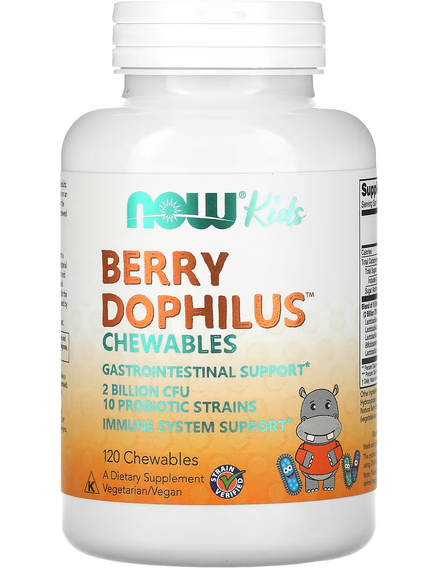 BerryDophilus™ NOW® містить 2 млрд КУО в поєднанні з 10 клінічно підтвердженими штамами пробіотичних бактерій, які підтримують здоров’я шлунково-кишкового тракту та імунної системи. Здорова кишкова флора також допомагає створити сприятливе середовище для засвоєння поживних речовин. BerryDophilus™ можна застосовувати як дорослим, так і дітям. Таблетки BerryDophilus™, підсолоджені ксилітолом, не завдають шкоди зубам і мають відмінний смак.