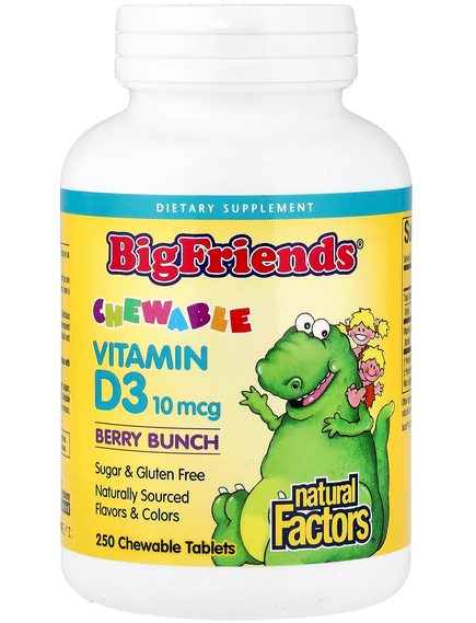 Харчова добавка. Дієтична добавка. Big Friends Жувальний вітамін D3 10 мкг 400 МО зі смаком ягід 250 жувальних таблеток.