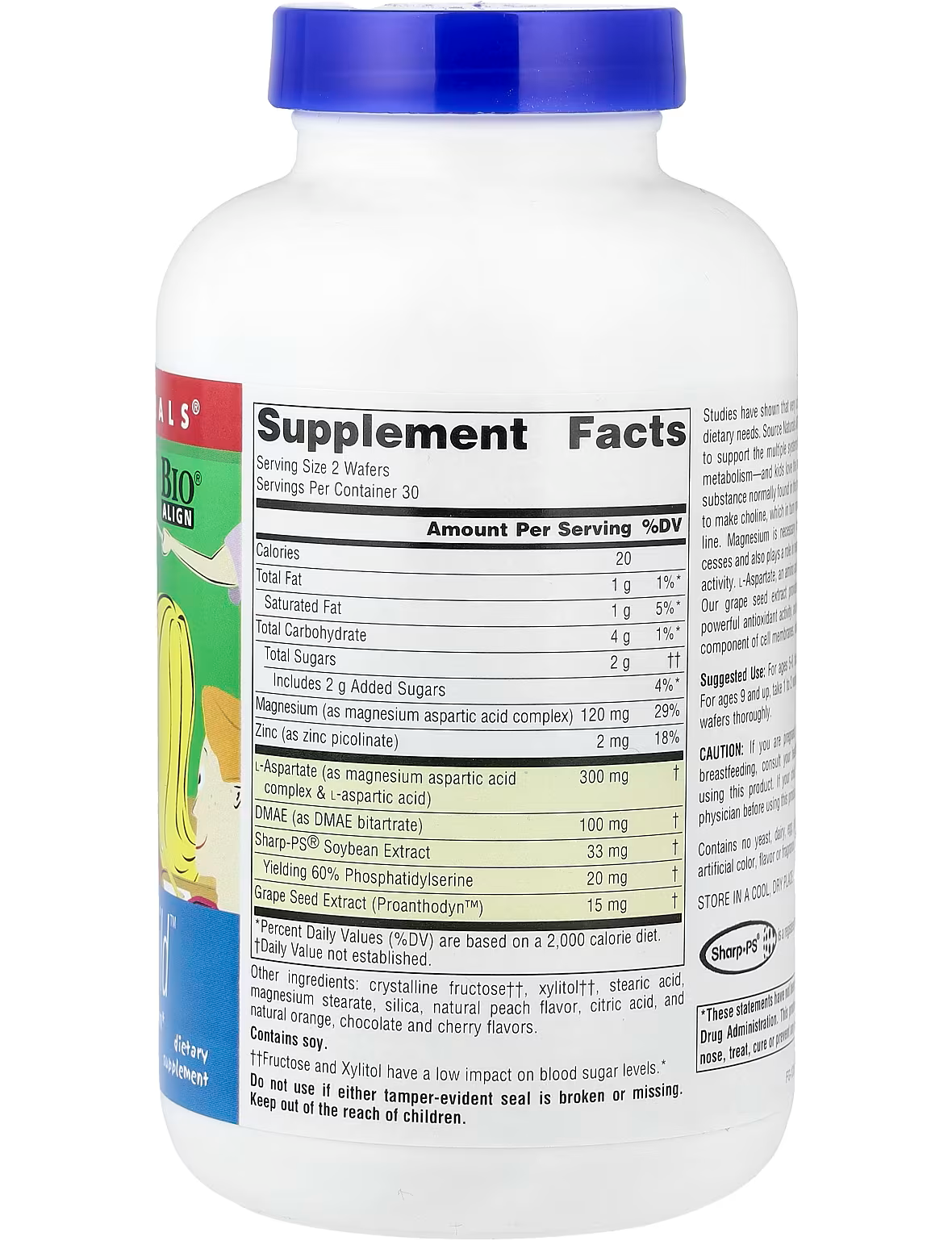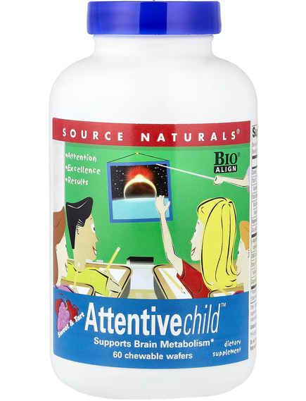 Дослідження показали, що дуже активні діти можуть мати особливі харчові потреби. Добавка Attentive Child™ від Source Naturals розроблена для підтримки багатьох систем, що впливають на метаболізм мозку дитини. Діти обожнюють її солодкий і терпкий смак. ДМАЕ, речовина, яка зазвичай міститься в мозку, може використовуватися організмом для вироблення холіну, який, у свою чергу, може використовуватися для вироблення ацетилхоліну. Магній необхідний для багатьох метаболічних процесів, а також відіграє важливу роль у нервово-м’язовій передачі та активності. L-аспартат, амінокислота, діє як нейромедіатор. Наш екстракт виноградних кісточок містить проціанідини, які мають потужну антиоксидантну дію, а фосфатидилсерин — важливий компонент клітинних мембран, включно з мембранами мозку.