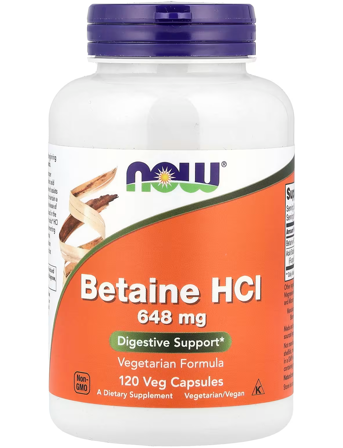 Бетаїну гідрохлорид NOW® розроблений для підтримки належного стану травлення в шлунку. Соляна кислота (гідрохлорид) зазвичай виробляється в шлунку, де сприяє перетравленню білків, активуючи пепсин, допомагає підтримувати здоровий баланс кишкової флори та стимулює вивільнення кишкових ферментів. Пепсин — це протеаза, що виробляється в шлунку й частково розщеплює білок у продуктах харчування. Виробництво гідрохлориду має тенденцію до зменшення з віком, тому доповнення приймання добавок із гідрохлоридом і пепсином може допомогти підтримувати нормальне травлення. У цьому продукті використовується вегетаріанська кислотостійка протеаза з активністю, еквівалентною активності пепсину тваринного походження.