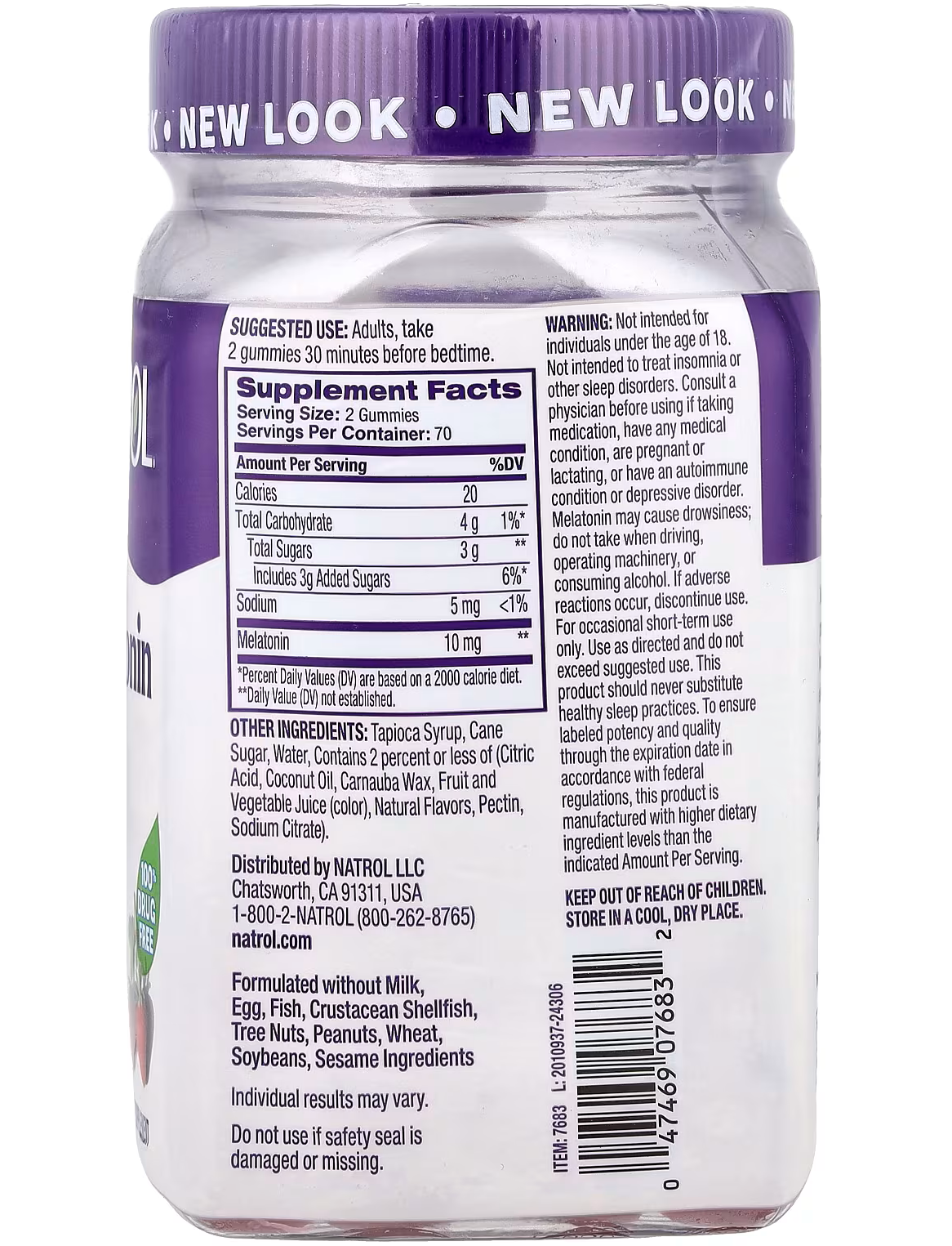 Не призначено для осіб віком до 18 років. Не призначений для лікування безсоння або інших розладів сну. Перед застосуванням слід проконсультуватися з лікарем, якщо приймаєте ліки, маєте будь-які захворювання, вагітні, годуєте грудьми, маєте аутоімунне захворювання або депресивний розлад. Мелатонін може викликати сонливість; не приймайте під час керування автомобілем, роботи з механізмами або вживання алкоголю. У разі виникнення побічних реакцій слід припинити використання. Тільки для нерегулярного короткочасного використання. Використовуйте згідно з інструкцією та не перевищуйте рекомендовану дозу. Цей продукт ніколи не повинен замінювати здоровий сон. Для забезпечення ефективності та якості на етикетці протягом терміну придатності відповідно до федеральних правил, цей продукт виготовляється з вищою кількістю дієтичних інгредієнтів, ніж указана кількість на порцію.