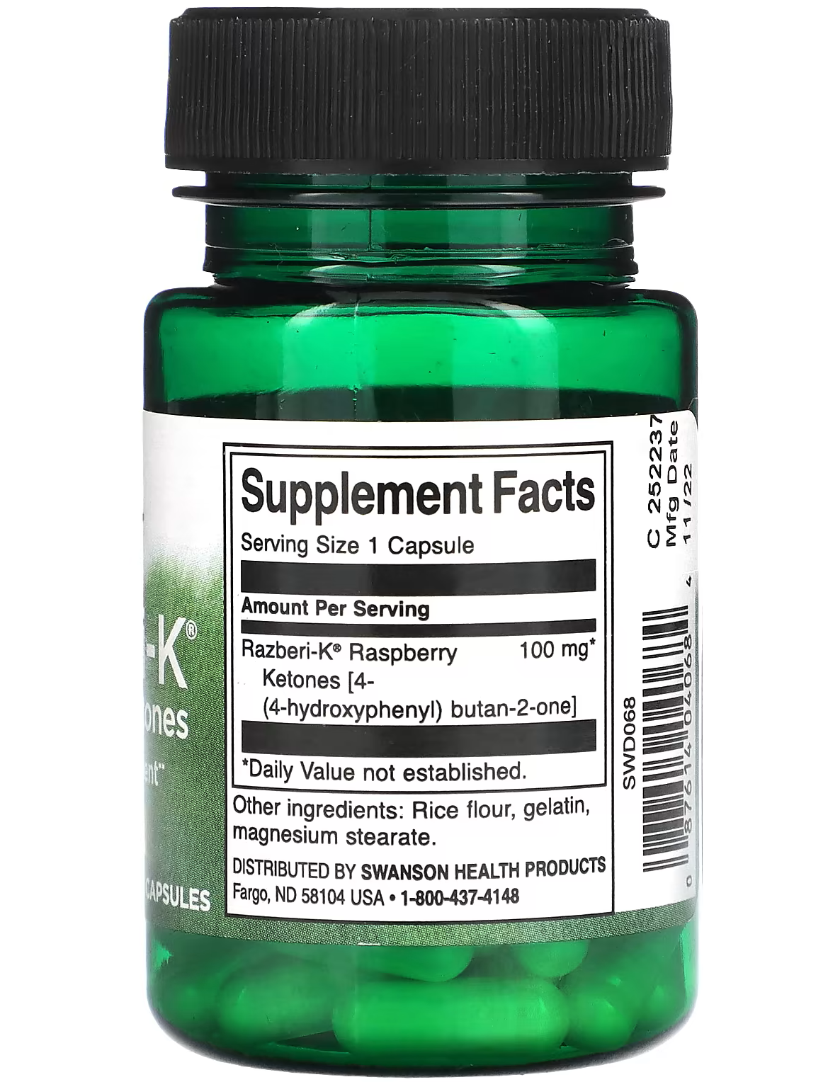 - Кількість в 1 порції: Малинові кетони Razberi-K® [4-(4-гідроксифеніл) бутан-2-он] 100 мг