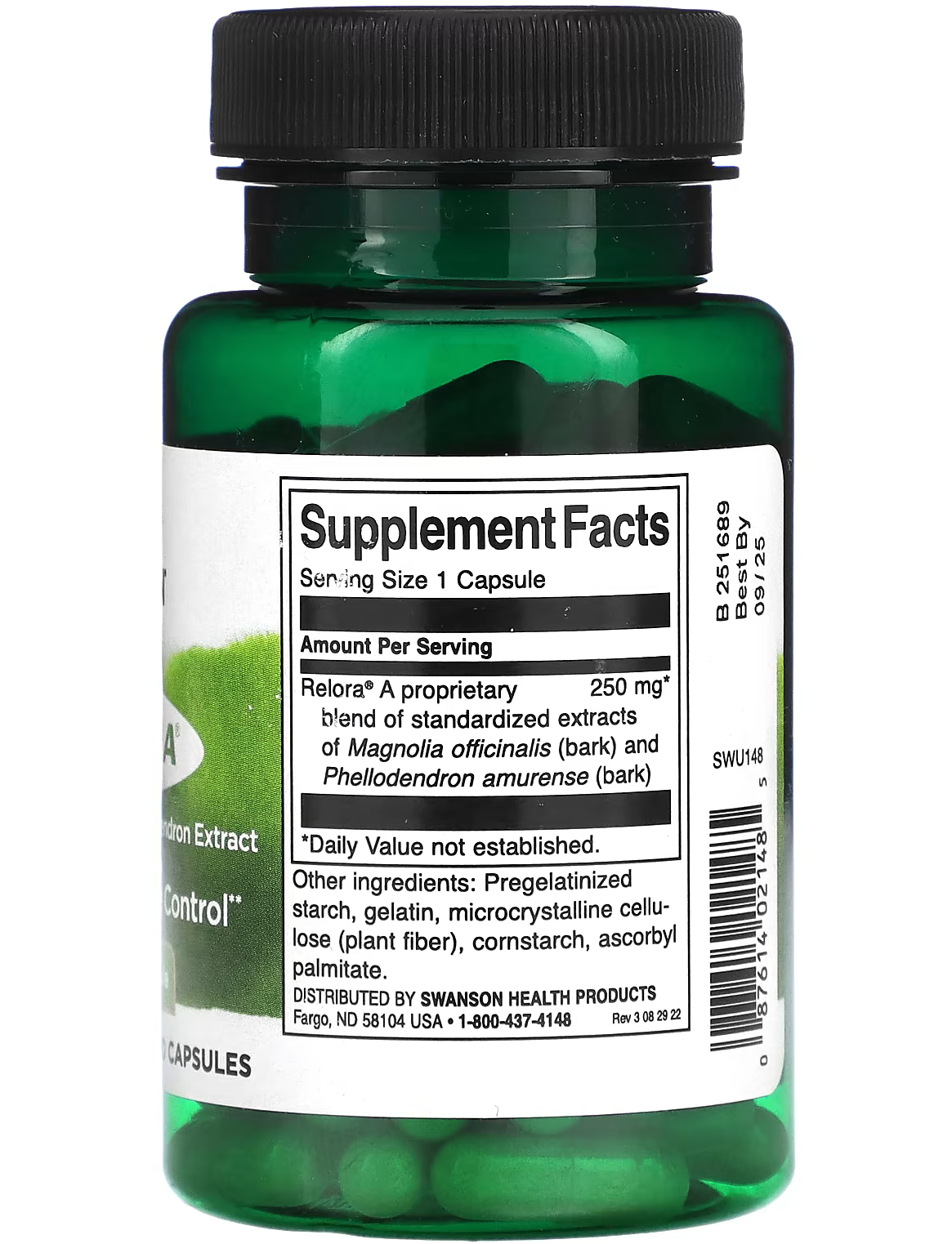 - Кількість в 1 порції: Relora® (запатентована суміш стандартизованого екстракту кори магнолії лікарської (Magnolia officinalis) та кори коркового дерева амурського [Phellodendron amurense) 250 мг