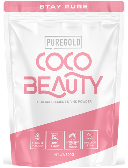 Pure Gold CocoBeauty – це ароматизований харчовий напій у вигляді порошку з додаванням гідролізованого колагену з яловичини та морської риби, порошку кокосової води, цинку, гіалуронової кислоти, коензиму Q10, вітамінів та підсолоджувачів.