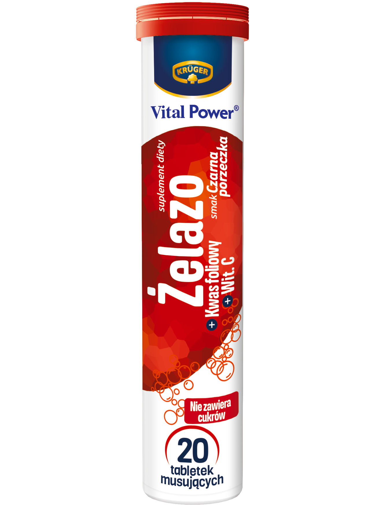 Склад: регулятори кислотності: лимонна кислота і карбонат натрію, наповнювач: сорбіт, порошок червоного бурякового соку, L-аскорбінова кислота (вітамін С), кукурудзяний крохмаль, заліза (II) сульфат, ароматизатор, підсолоджувачі: аспартам і ацесульфам К, барвник: рибофлавін, птероїлмоноглутамінова кислота (фолієва кислота).