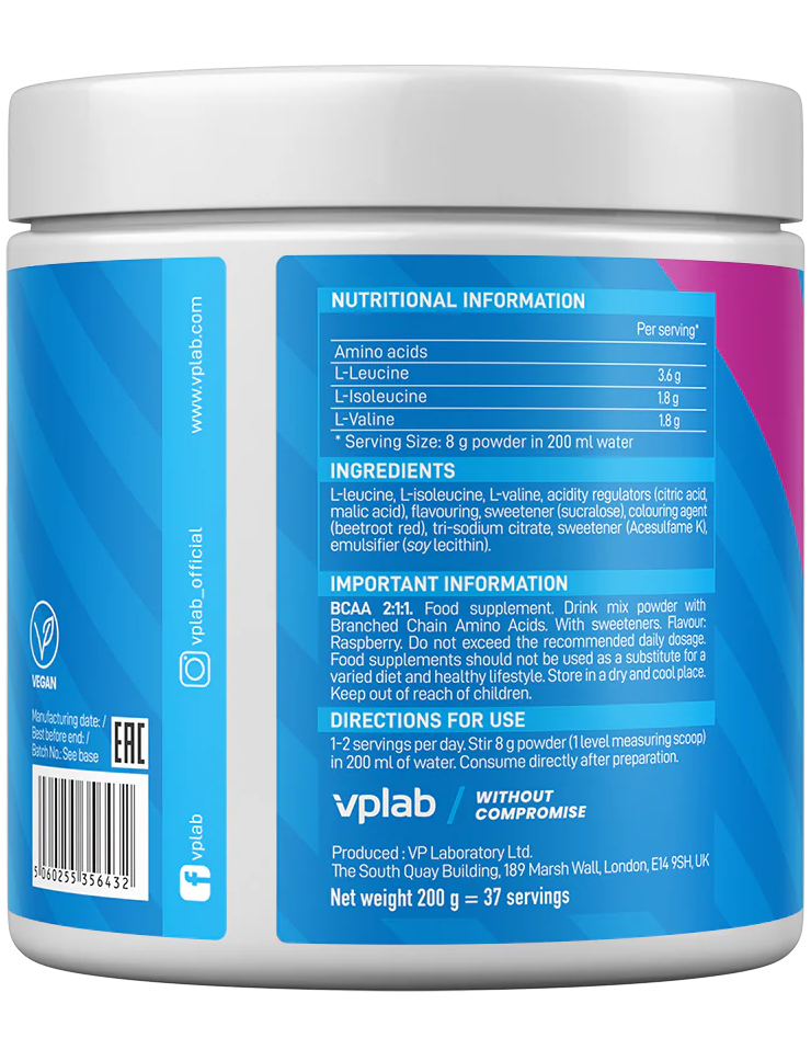 BCAA 2:1:1 від Vplab – це ультрамікронізований порошок нового покоління амінокислот BCAA, який забезпечує миттєву розчинність у воді та швидке засвоєння для підтримки та відновлення м’язової маси. Формула з оптимальним співвідношенням 2:1:1 (лейцин, ізолейцин, валін) запобігає руйнуванню м’язів та має чудовий смак без характерної гіркоти. Підходить для веганів та вегетаріанців.