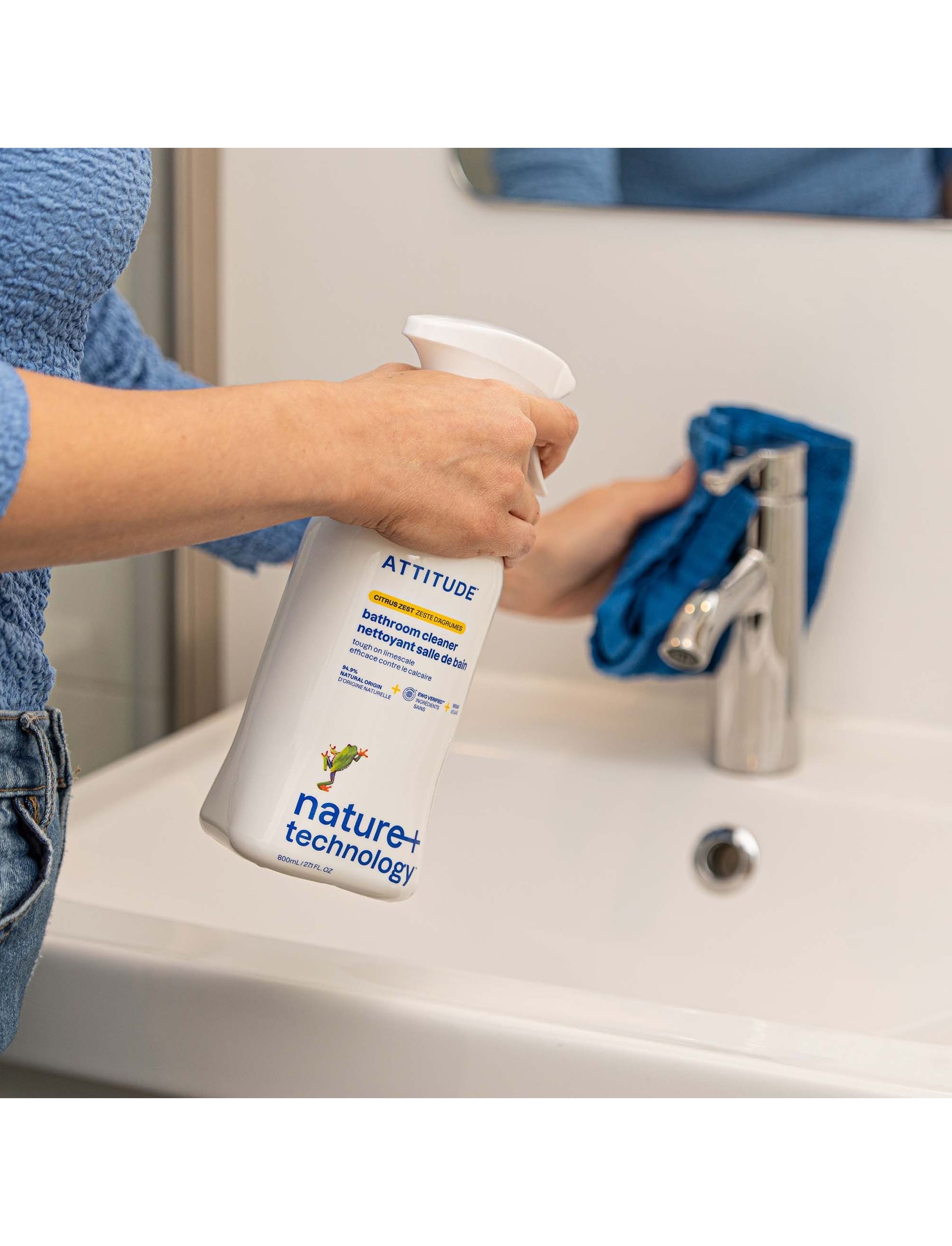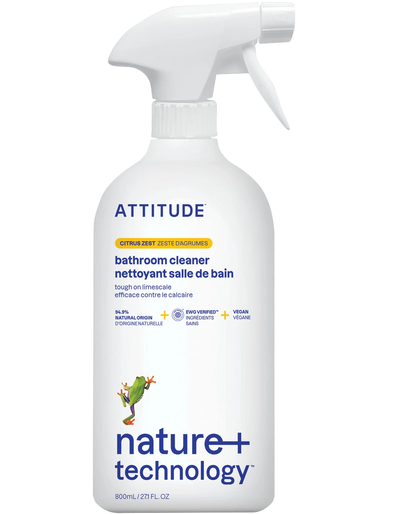 Наповнений свіжим та освіжаючим ароматом, засіб для чищення ванної кімнати ATTITUDE™ з цитрусовою цедрою ефективно видаляє вапняний наліт та бруд з керамічної плитки, ванни, дверей душової кабіни, шторок та унітазу.