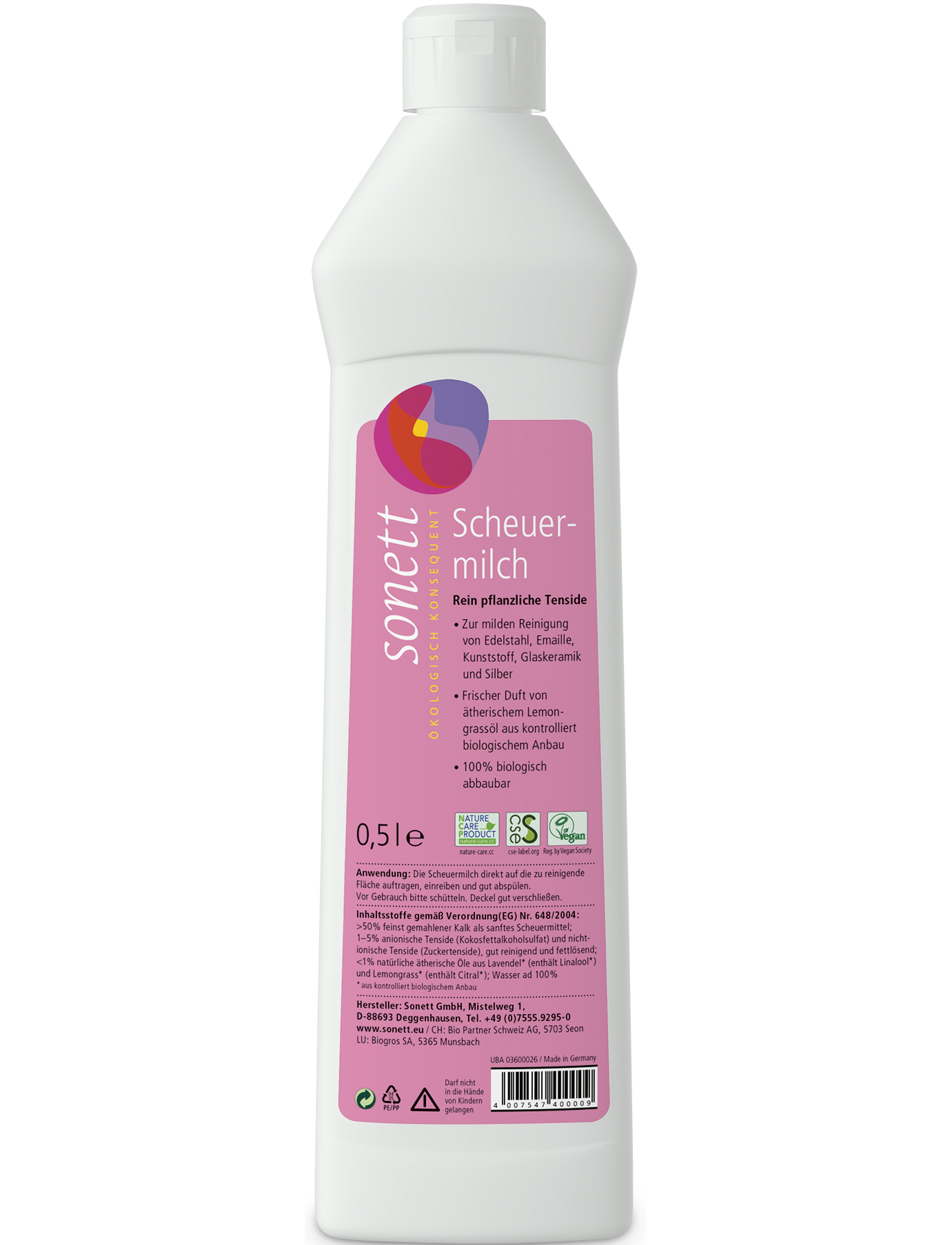 Молочко для чищення Sonett виготовлено на основі чистого вапняного порошку та є надзвичайно ніжним та щадним у використанні. Натуральна суміш лавандово-цитрусових олій має невеликий ароматизуючий ефект.