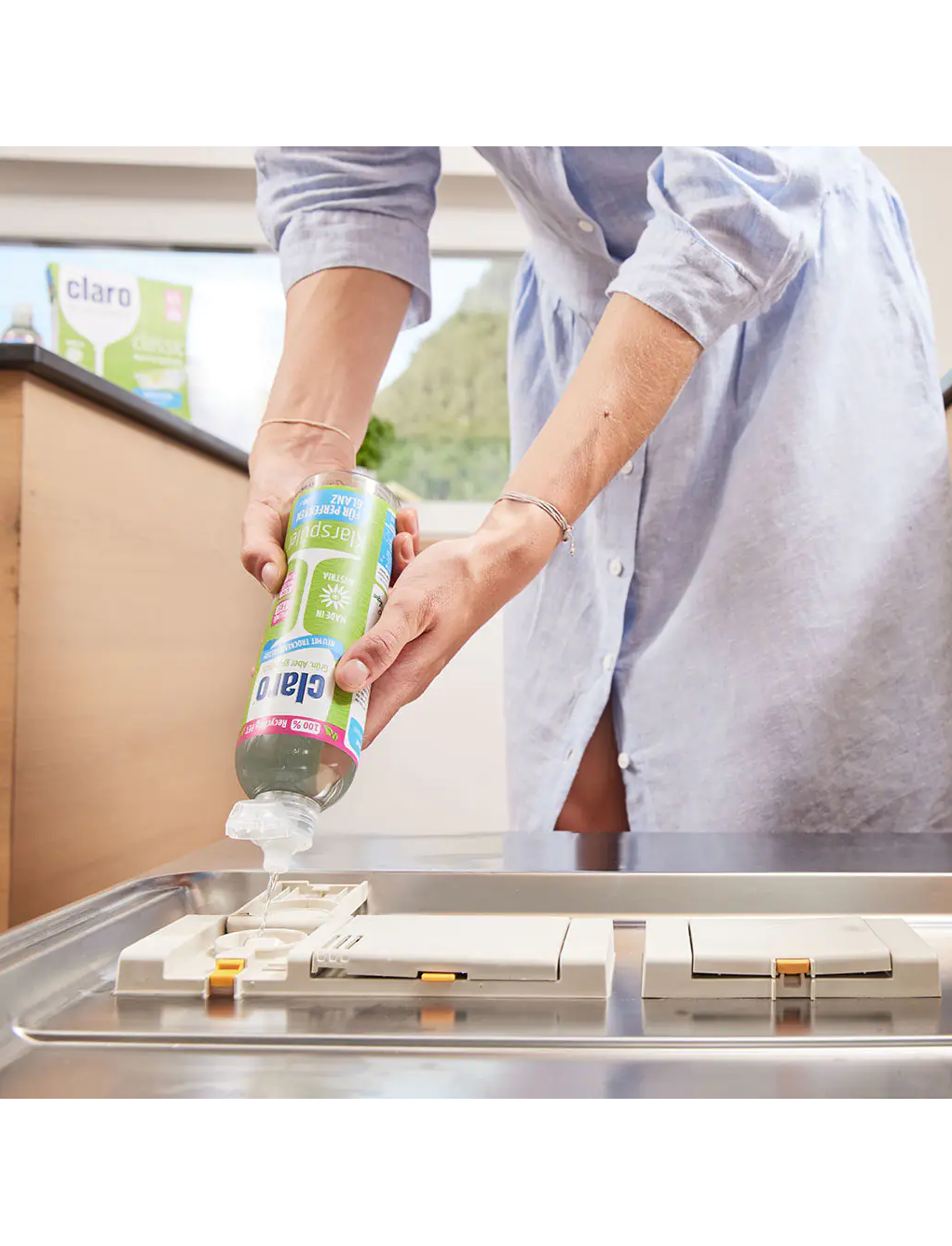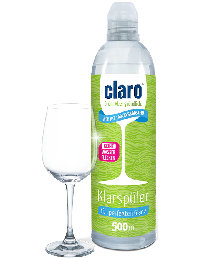 Ополіскувач Claro прискорює процес висихання. Ополіскувач забезпечує блиск наприкінці циклу полоскання без плям води чи вапняного нальоту.