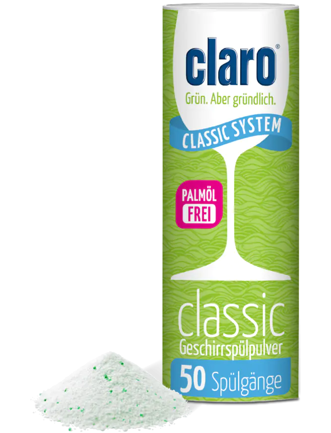 Класичний порошок з самого початку був героєм миття посуду. І для багатьох так і залишилося. Класичний порошок Claro ECO можна мити в посудомийній машині в найчистішому вигляді, він переконує своєю ідеальною ефективністю чищення та легким дозуванням за допомогою нашої нової інноваційної ємності для дозування. Вибір порошку чи таблеток залежить від ваших уподобань. Звичайно, наш порошок виробляється без фосфатів і хлору. Саме тому він був нагороджений австрійським екомаркуванням та європейським екомаркуванням.