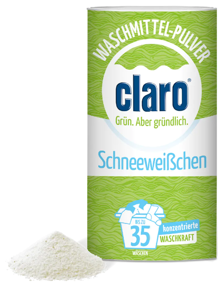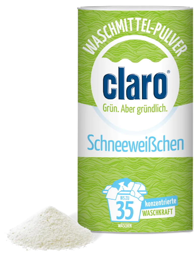 З 1995 року ми очищаємо ваші тарілки та склянки екологічно чистим способом, а тепер ми хочемо отримати вашу білизну. Представляємо: новий пральний порошок claro під назвою Schneeweißchen. Справжній природний талант, заснований на відновлюваній сировині, без алергенів і мікропластику.