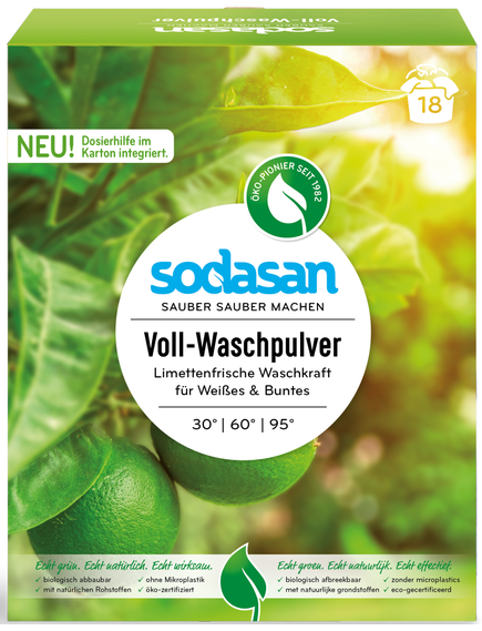 Інноваційна формула із сертифікованим органічним рослинним милом і содою вивільняє свою очищувальну силу лише за 30 градусів і підходить для глибокого очищення всіх текстильних волокон, крім вовни та шовку.