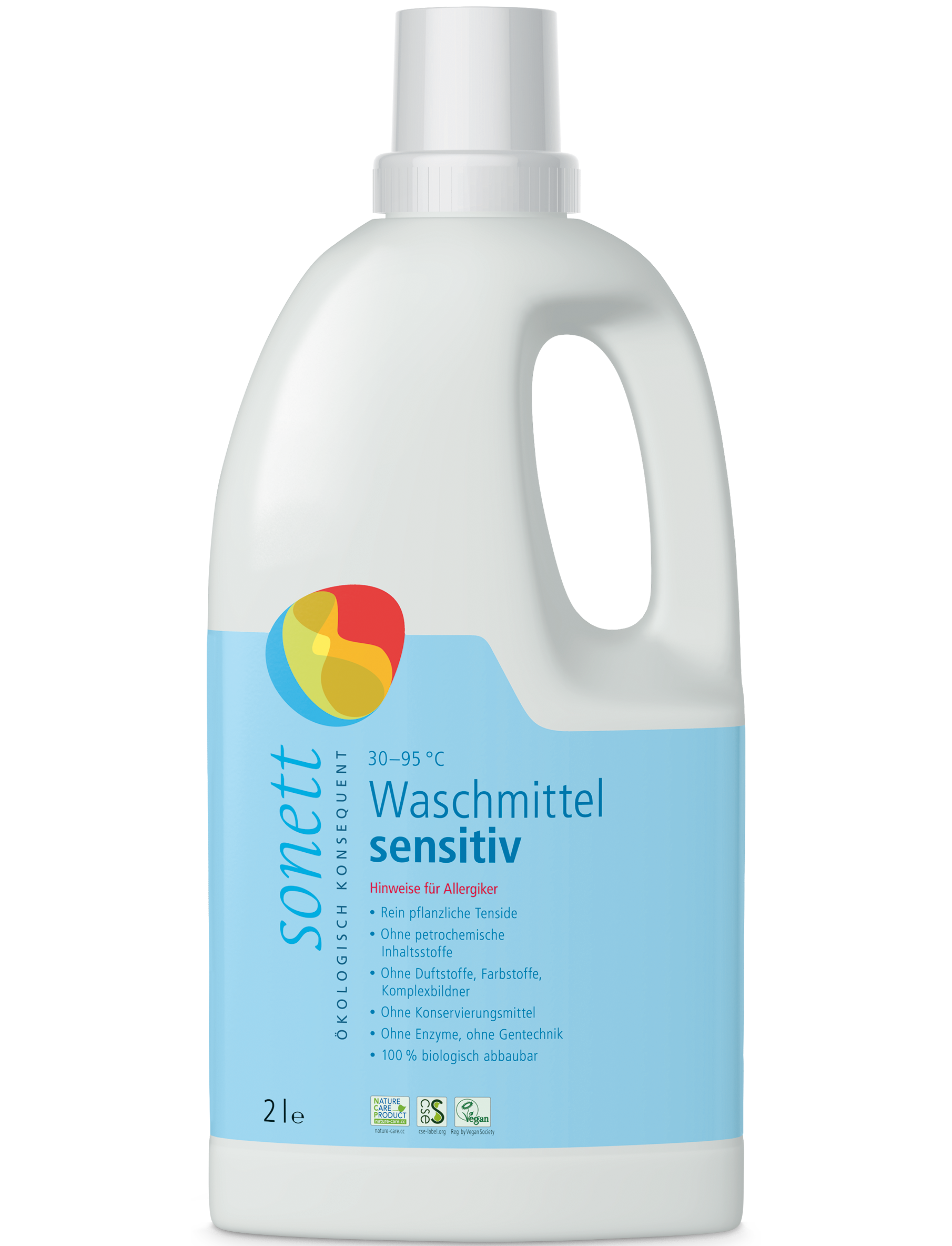 Спеціальний, енергозберігаючий метод омилення Sonett, використання олії з контрольованого органічного вирощування та надзвичайно вигідне співвідношення ціни та ефективності прання для рідких миючих засобів є видатними характеристиками прального засобу Sensitive без запаху.