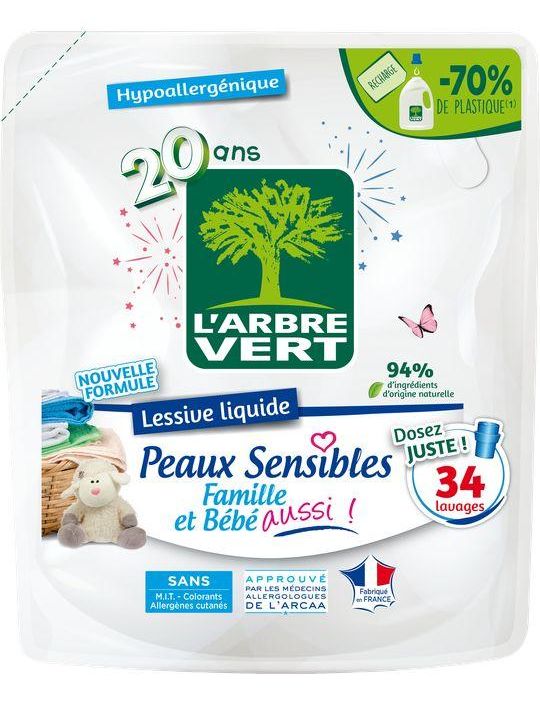Моющее средство для чувствительной кожи L'Arbre Vert не содержит ферментов, красителей и MIT*. Это гипоаллергенное моющее средство, разработанное для минимизации риска кожной аллергии, подходит для всей семьи, даже для младенцев и людей с особо чувствительной кожей. Жидкое моющее средство производства Франции.