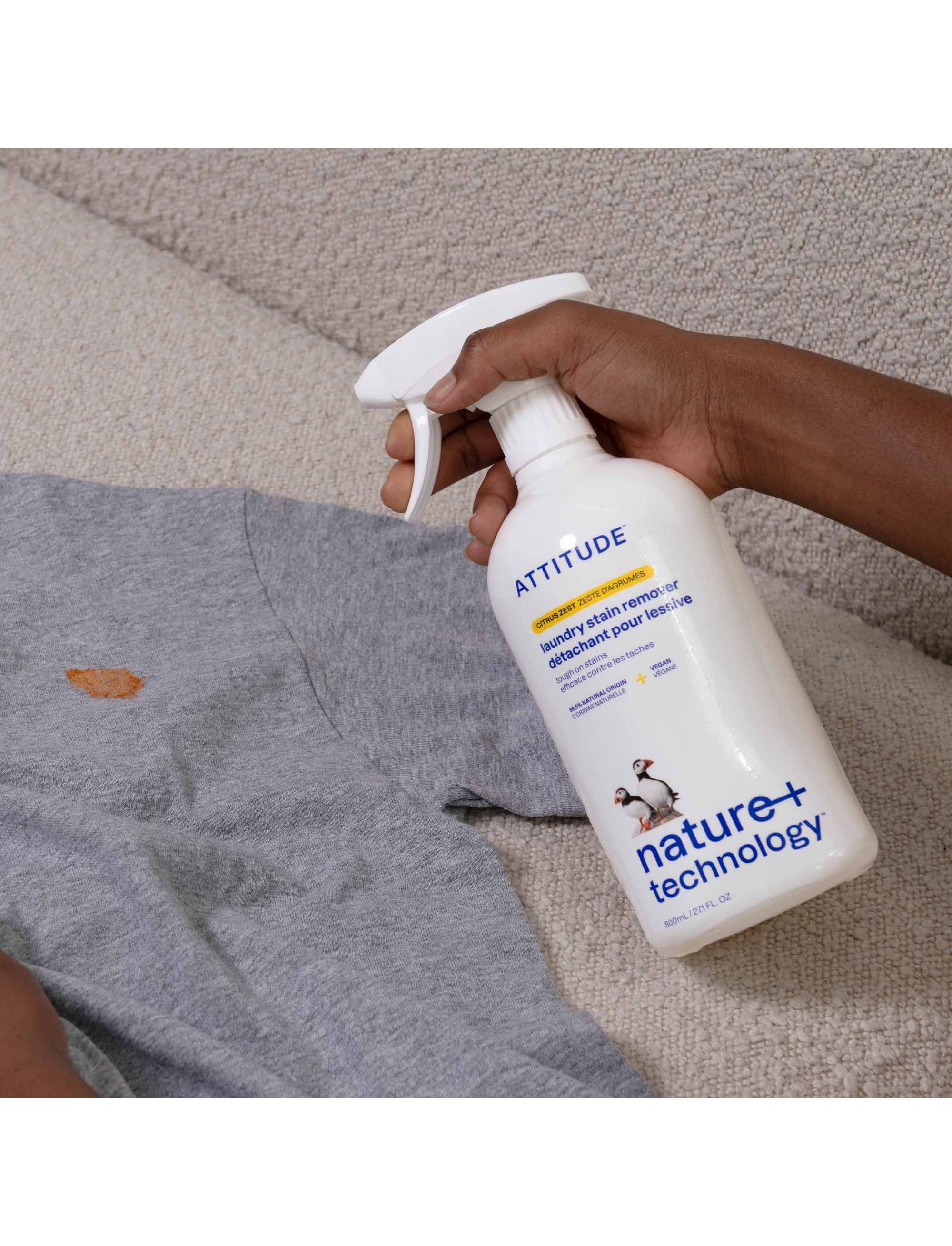 Розпиліть безпосередньо на пляму. Втирайте засіб для виведення плям ATTITUDE™ у тканину. Залиште діяти на 1-5 хвилин залежно від ступеня забруднення. Виперіть із пральним порошком ATTITUDE™. Завжди перевіряйте етикетки на наявність спеціальних інструкцій. Не допускайте висихання на одязі. ЗБЕРІГАТИ В НЕДОСТУПНОМУ ДЛЯ ДІТЕЙ МІСЦІ.