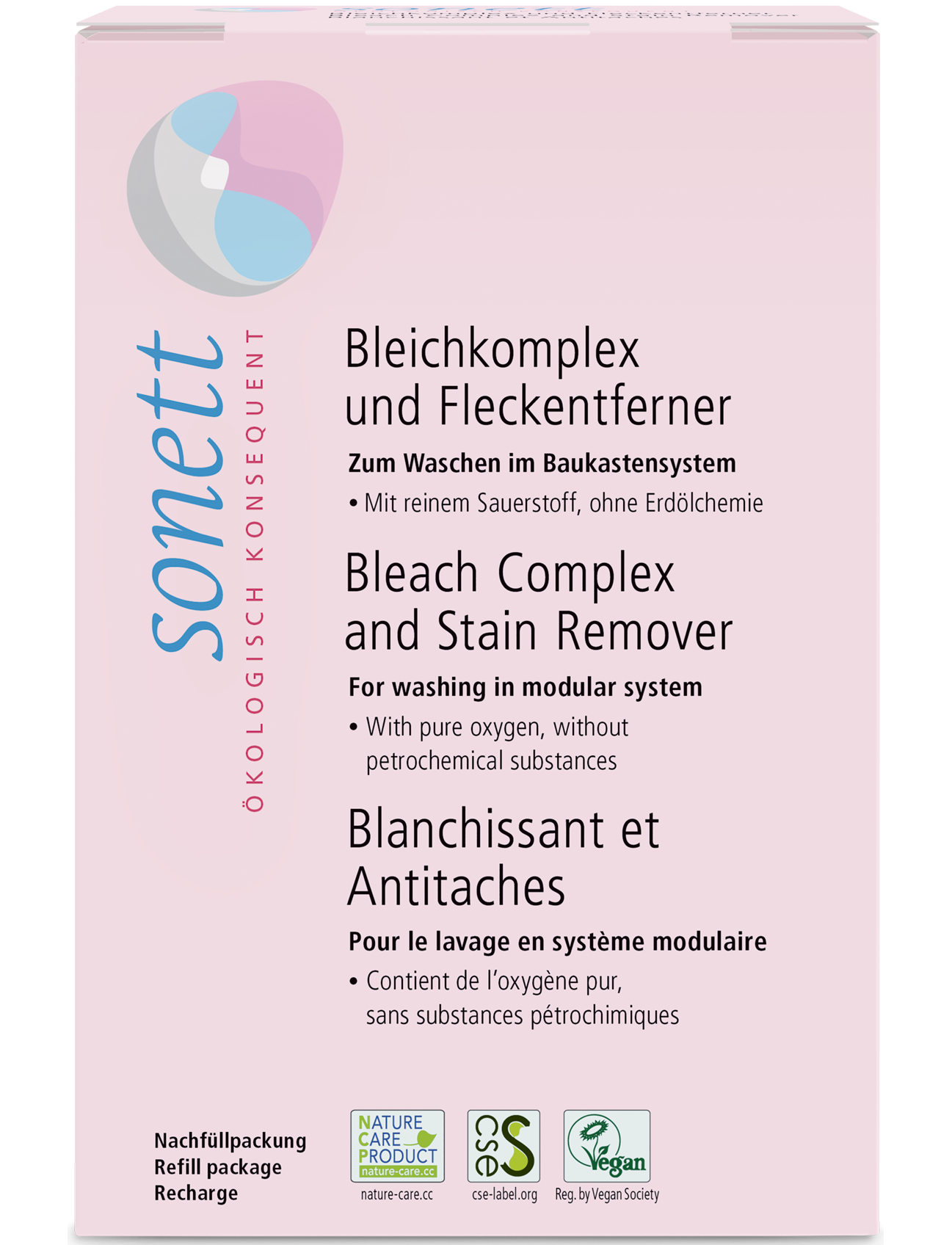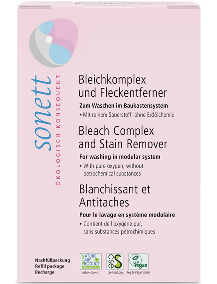 Оскільки ми не використовуємо нафтохімічні активатори відбілювача, комплекс відбілювача та засіб для виведення плям Sonett ефективні лише в пральній машині при температурі вище 50 °C. Якщо відбілювач може працювати протягом більш тривалого періоду часу, наприклад, замочивши його на ніч, він буде ефективним при температурах до 30 °C.