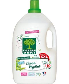 L'arbre Vert, Франция / Lessive au Savon Vegetal / универсальный гель для стирки белых и цветных вещей для всей семьи / уникальная формула геля не только активно борется с разнообразными загрязнениями и пятнами на светлых и темных тканях, но и заботиться о чувствительной коже / гель разработан на основе натурального растительного мыла / придает стиранным вещам особую нежность и мягкость / обладает свежим нейтральным ароматом / активное действие геля уже при температуре 30 градусов / большой экономный формат / 4900 мл