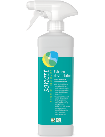 Суто рослинні інгредієнти характеризують цей дезінфікуючий засіб для поверхонь, який є справжньою альтернативою добре відомим продуктам, виготовленим із синтетичних активних інгредієнтів з їх проблемними побічними ефектами. Спирт використовувався для дезінфекції протягом століть, і на сьогоднішній день невідомо мікроорганізмів, стійких до спирту.