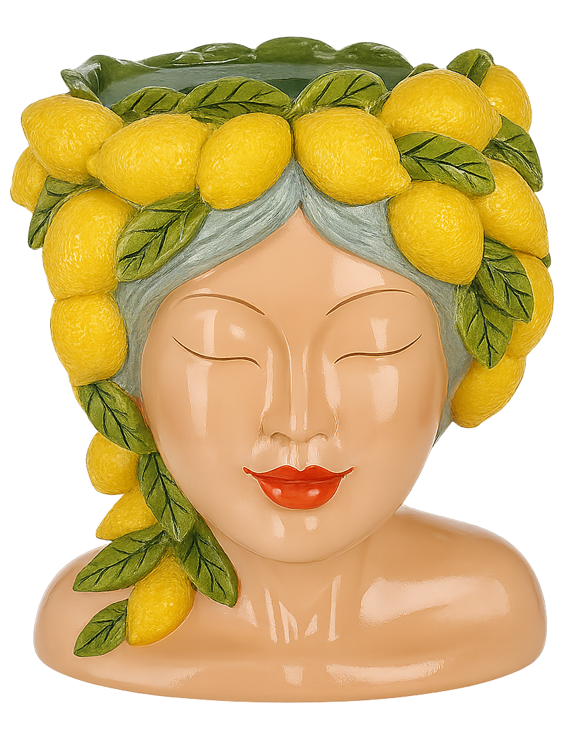 Ця ваза-кашпо виконана у вигляді жіночого бюста з ніжними рисами обличчя та закритими очима, що створює враження спокою та гармонії. Волосся героїні стилізовано під гроно стиглих лимонів з яскраво-зеленим листям, що символізує сонце, тепло та родючість. Завдяки відкритій верхній частині, виріб можна використовувати як кашпо для кімнатних рослин, вазон для сухоцвітів, або стильну ємність для декоративного зберігання.