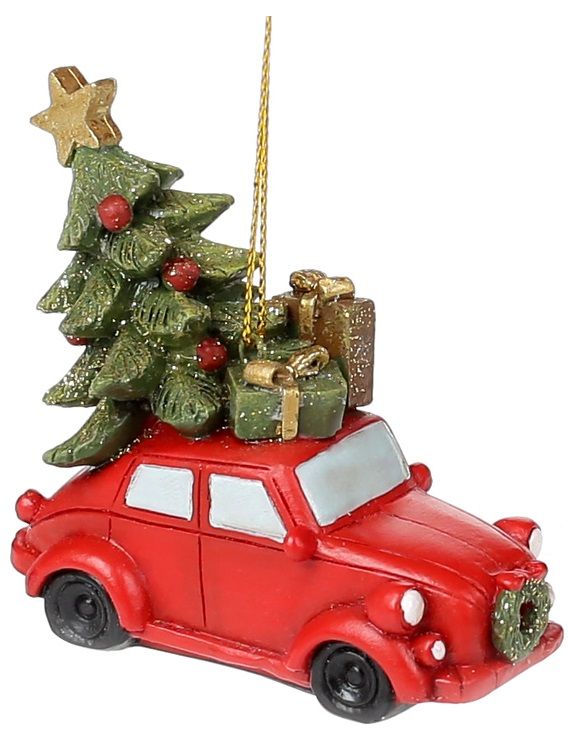 Ялинкова іграшка Червона машинка з ялинкою та подарунками 7 см