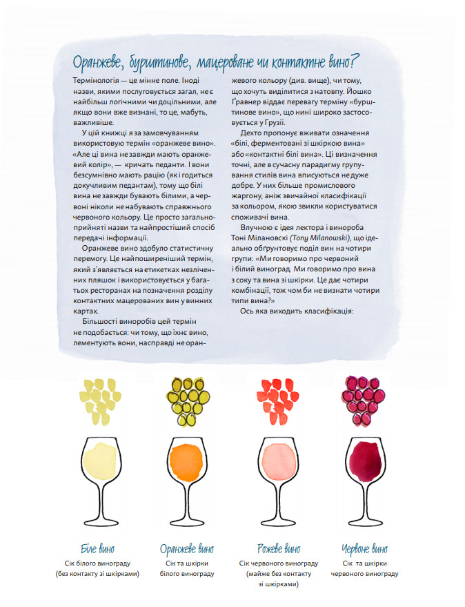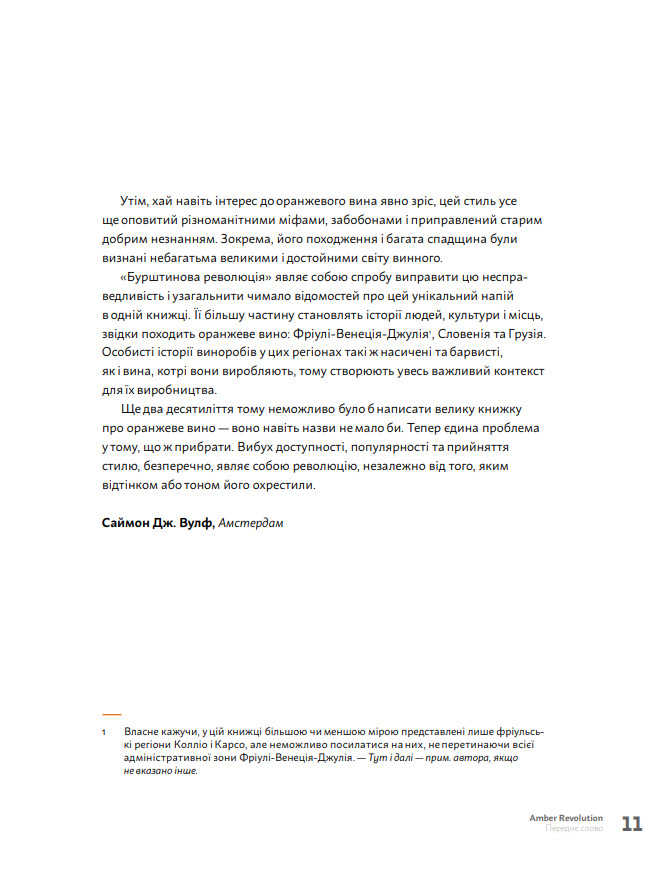 Термін «оранжеве вино» з’явився 2004 року. Нині цей стиль набуває дедалі більшого поширення, а найвідоміша книжка від експерта і популяризатора оранжевого вина Саймона Вулфа «Amber Revolution: Як світ закохався в оранжеве вино» нарешті доступна і для українського читача. У ній також уміщено інформацію про 180 виробників оранжевого вина із 20 країн усього світу. Крім того, це видання багато ілюстроване фотографіями з виноробень, запаморочливими пейзажами, а також портретами самих виноробів. Ця книжка стане в пригоді всім винолюбам, сомельє, рітейлерам чи виробникам оранжевого вина.