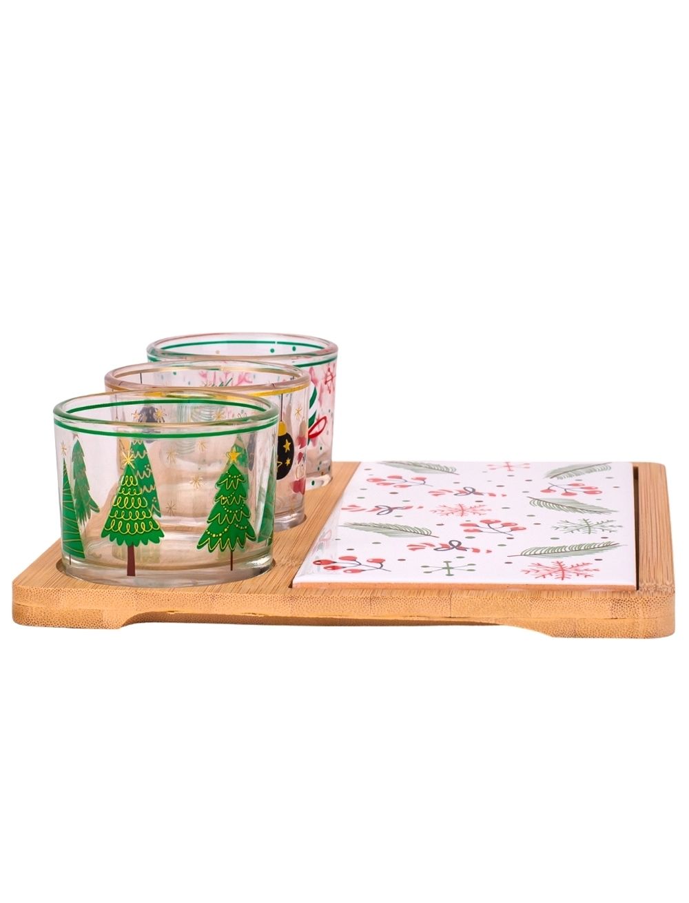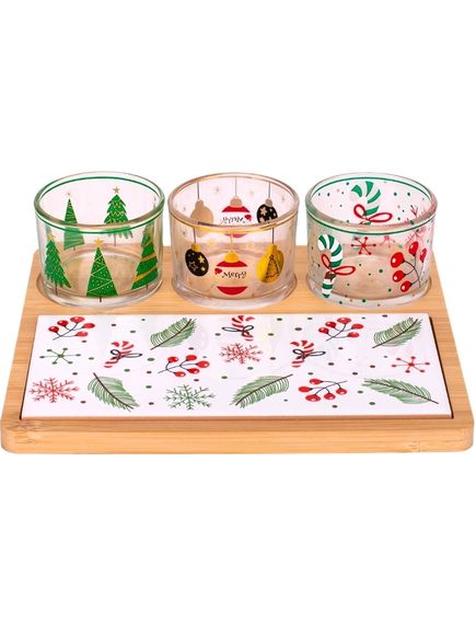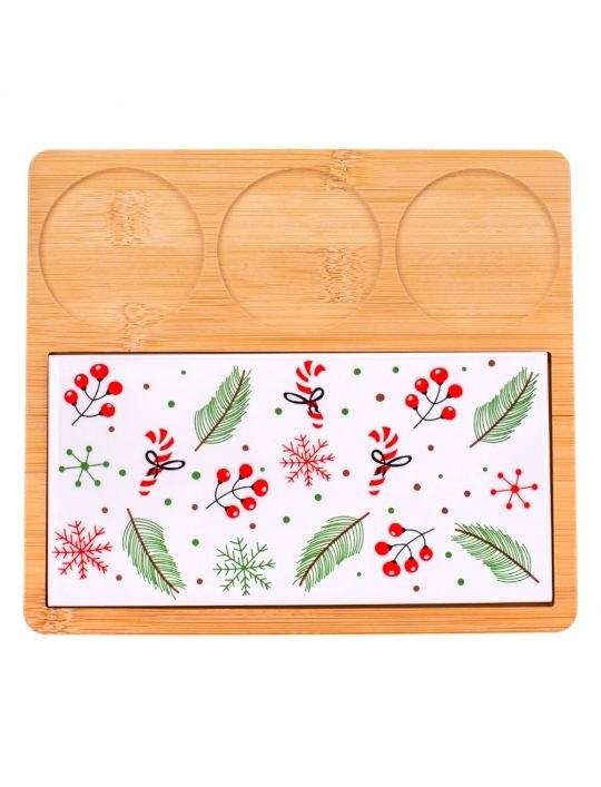 Набір скляних піал з керамічною дощечкою на бамбуковій підставці - стильний комплект для сервірування, який поєднує в собі естетику та функціональність. Скляні піалки та керамічна дощечка мають святковий дизайн та зручно розміщені на бамбуковій підставці. Бамбукова підставка створює не лише естетичний акцент, але й забезпечує стійкість і зручність при сервіруванні столу. Загалом, цей набір - це не лише стильний елемент сервірування, але й практичний аксесуар, який додасть елегантності вашому столу та підкреслить особливість сервіровки страв. Цей набір чудово підходить для подачі різдвяних частувань, закусок, солодощів, додаючи затишку та святковості вашому столу.