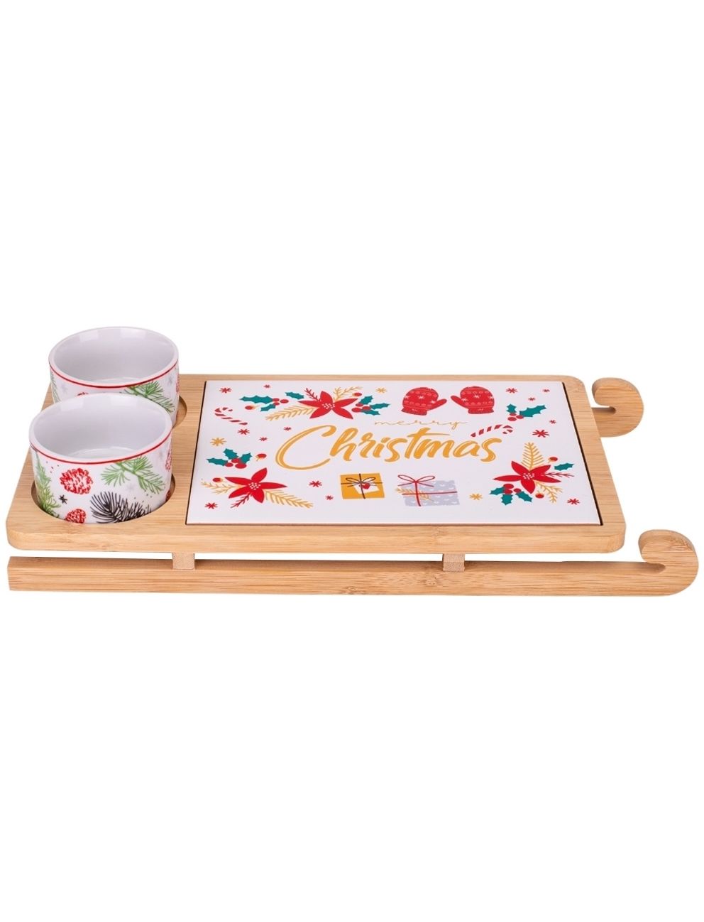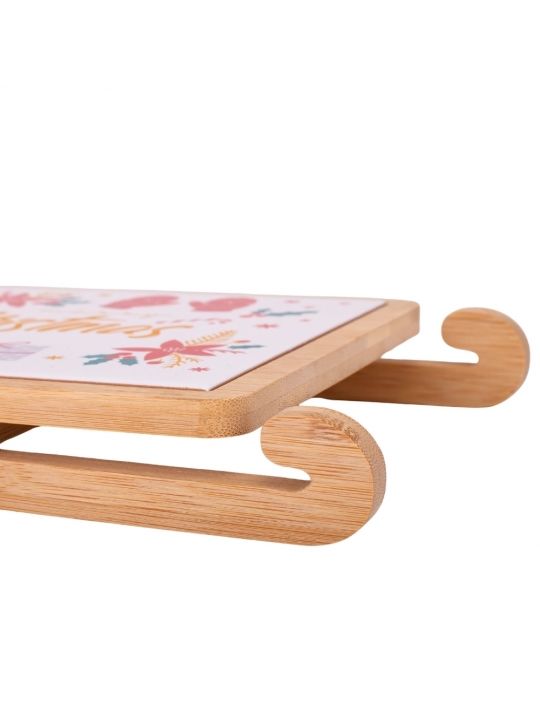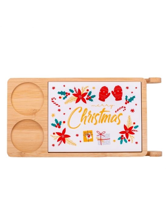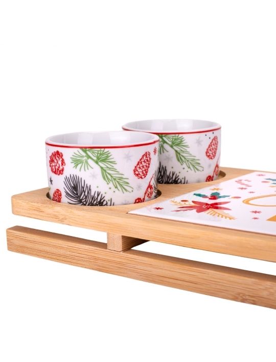 Набір керамічних піал з дощечкою на бамбуковій підставці у вигляді саней - стильний комплект для сервірування, який поєднує в собі естетику та функціональність. Керамічні піалки та дощечка мають святковий дизайн та зручно розміщені на бамбуковій підставці. Бамбукова підставка створює не лише естетичний акцент, але й забезпечує стійкість і зручність при сервіруванні столу. Загалом, цей набір - це не лише стильний елемент сервірування, але й практичний аксесуар, який додасть елегантності вашому столу та підкреслить особливість сервіровки страв. Цей набір чудово підходить для подачі різдвяних частувань, закусок, солодощів, додаючи затишку та святковості вашому столу.