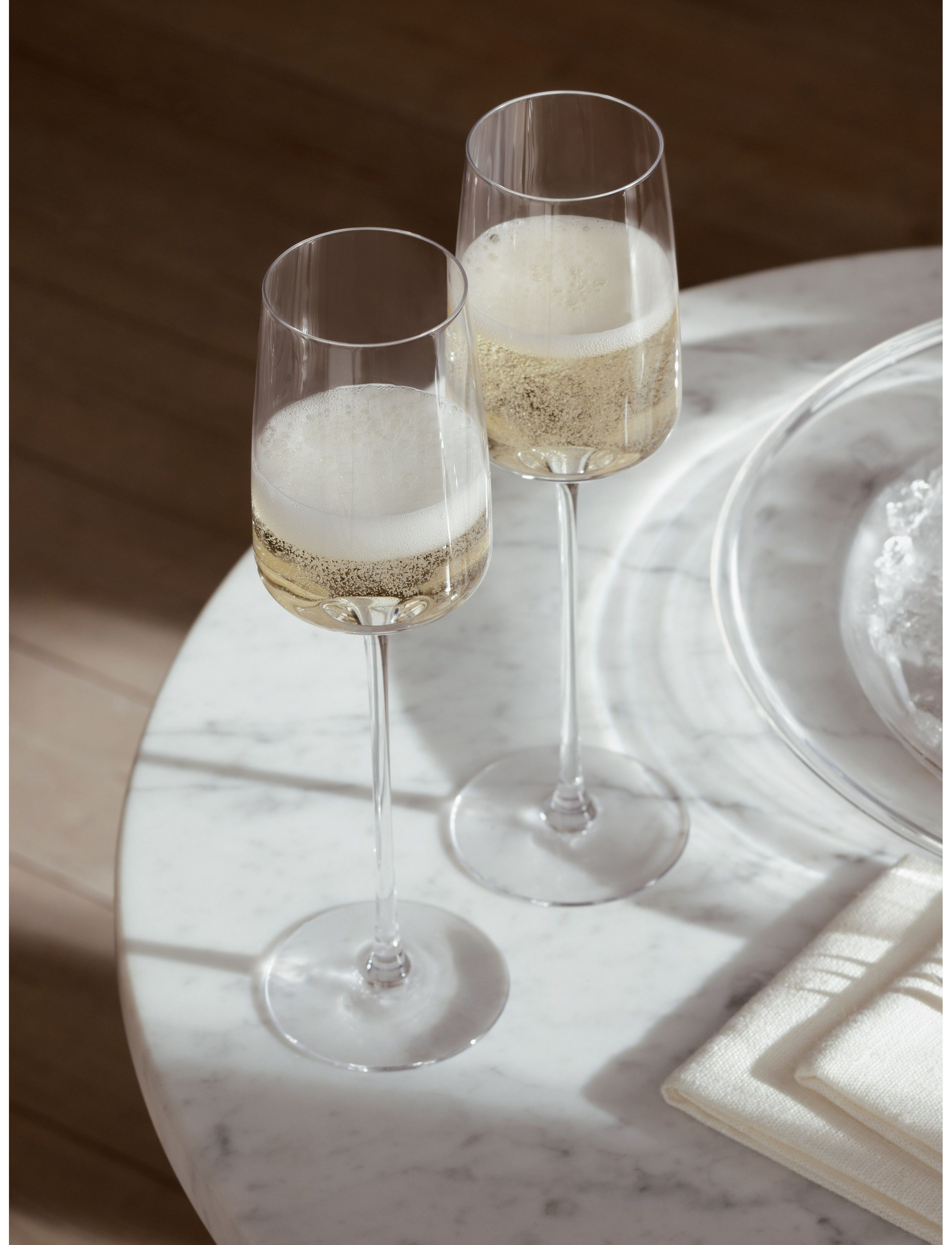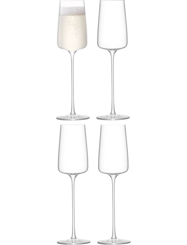 Набір із чотирьох сучасних флейт для шампанського з високими елегантними ніжками. Велика кутова чаша звужується до тонкого краю. Виготовлений із кристалічного скла, що не містить свинцю, для прозорості та міцності.