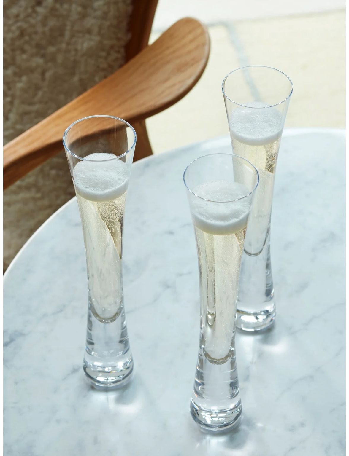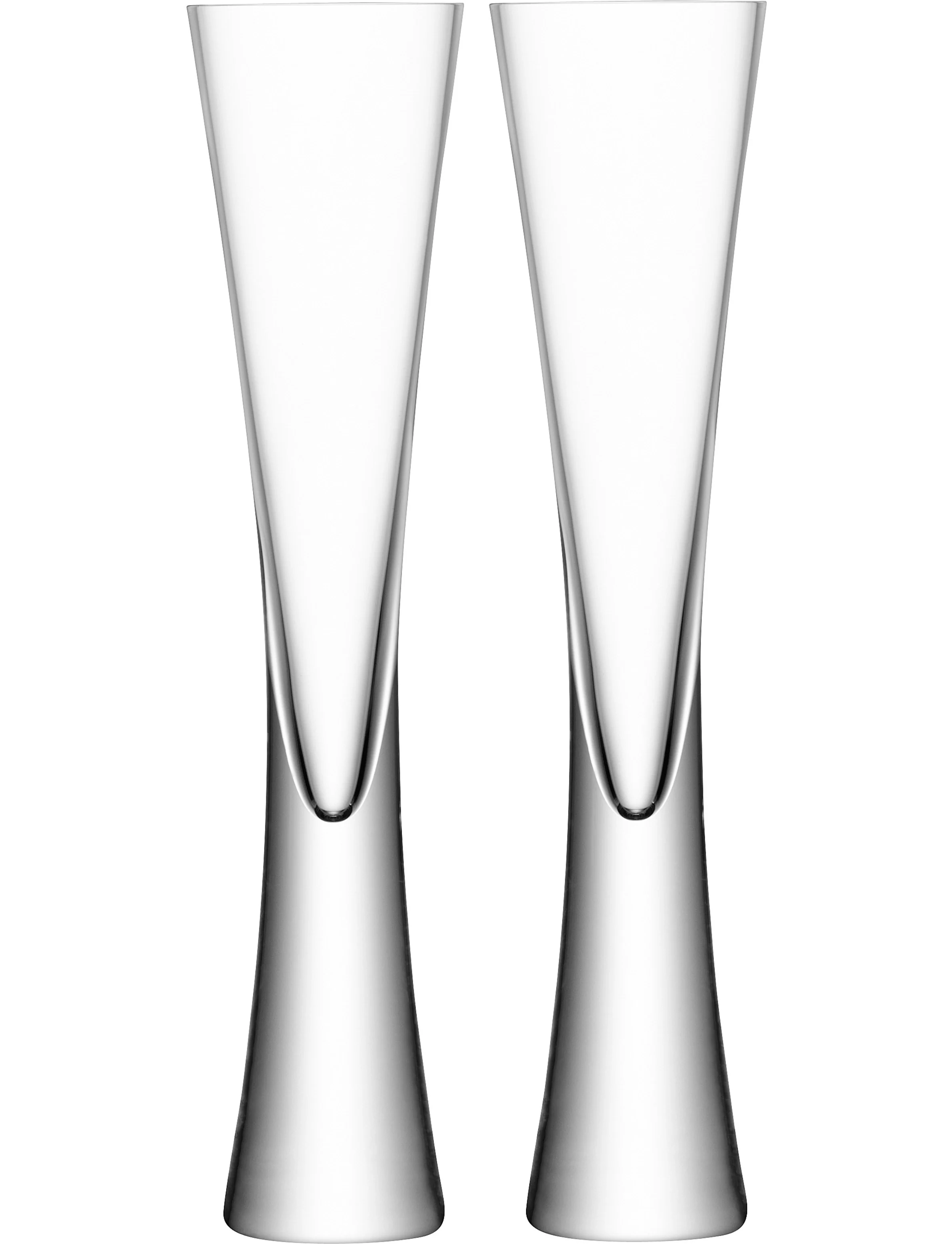 Набір із двох флейт для шампанського, що видуваються ротом, із тонкими чашами, які звужуються до товстих розкльошених ніжок.