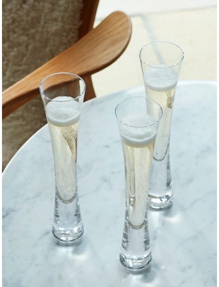 Видуваний досвідченими склодувами як єдиний шматок скла для створення сучасної флейти для шампанського з товстим, звуженим стрижнем і тонким обідком. Обід кожної флейти відполірований вогнем для досягнення гладкості.