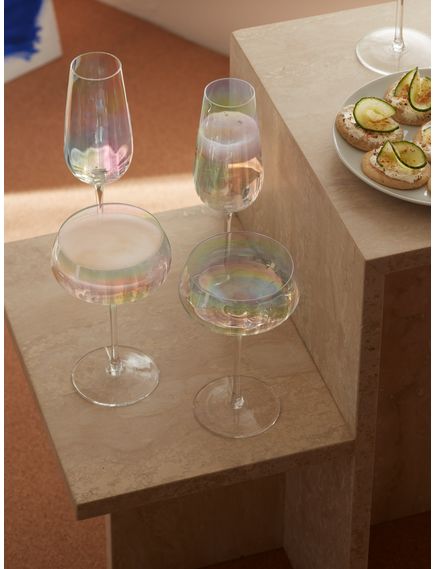 Колекція видувного скла, розписаного вручну з перламутровим блиском. Тонка текстура скла вловлює світло, підсилюючи райдужне покриття.