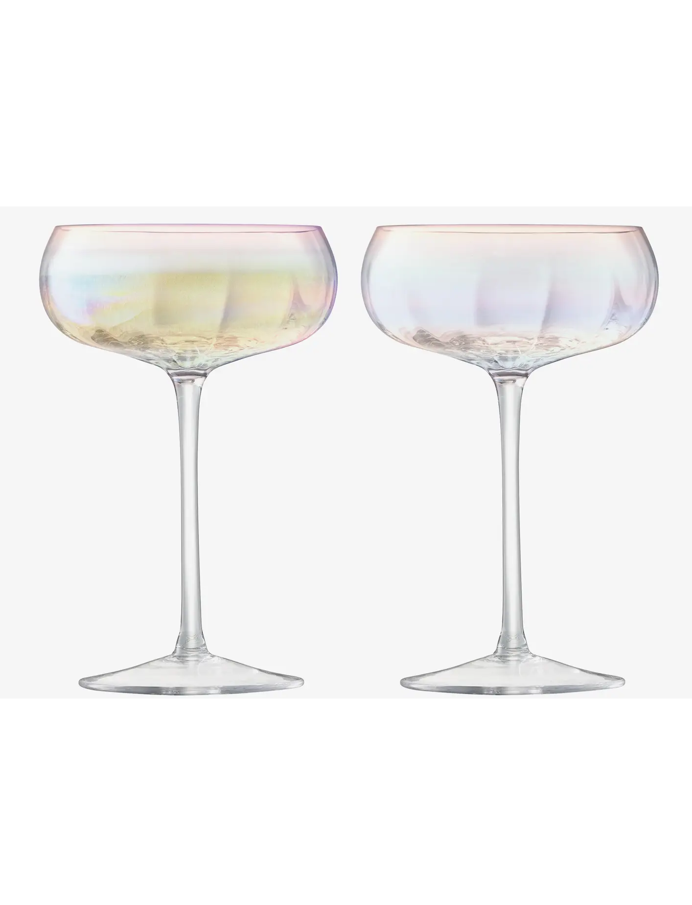Набір із двох роздувних купе, розписаних вручну райдужним блиском. Чаші мають ледь помітну рифлену текстуру, яка зникає до краю.